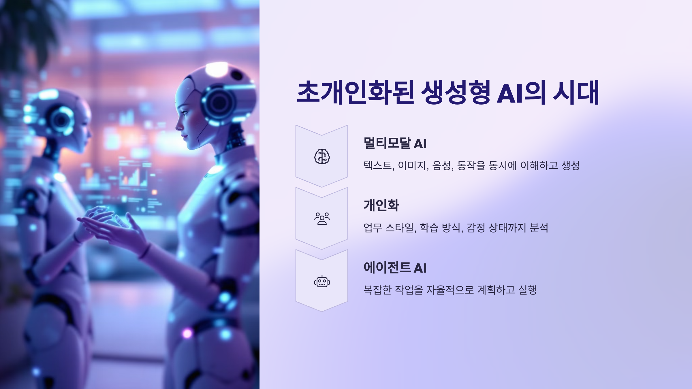 2025년 생성형 AI는 단순한 텍스트나 이미지 생성을 넘어 완전히 개인화된 경험을 제공하는 단계로 진화했습니다. 멀티모달 AI는 이제 텍스트, 이미지, 음성, 동작을 동시에 이해하고 생성하며, 더 나아가 개인의 상황과 선호도를 깊이 이해합니다. 이러한 AI 시스템은 여러분의 업무 스타일, 학습 방식, 심지어 감정 상태까지 분석하여 정확히 필요한 순간에 필요한 정보와 지원을 제공합니다. 특히 주목할 만한 발전은 에이전트 AI로, 복잡한 작업을 자율적으로 계획하고 실행하는 능력을 갖추었습니다.