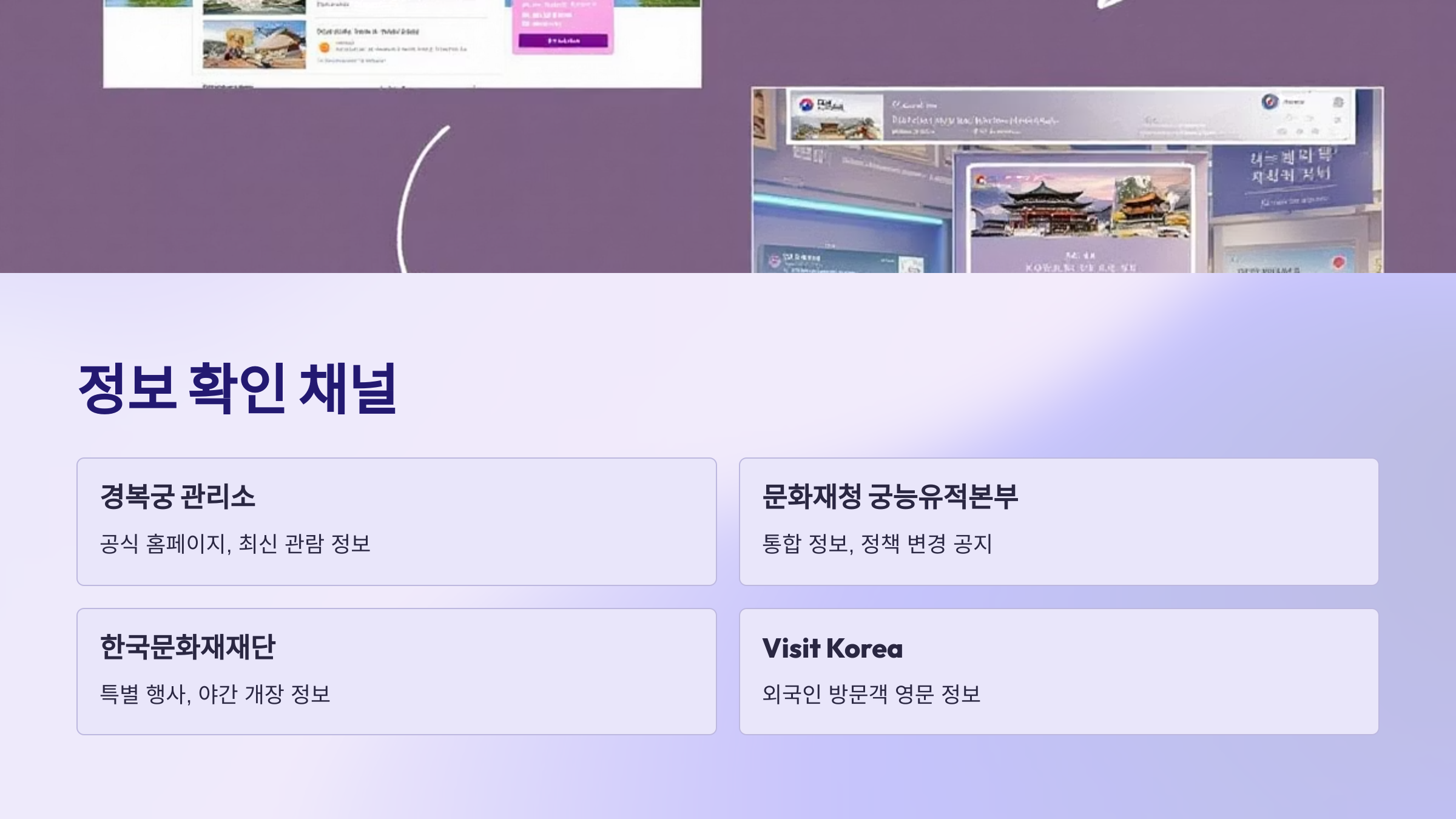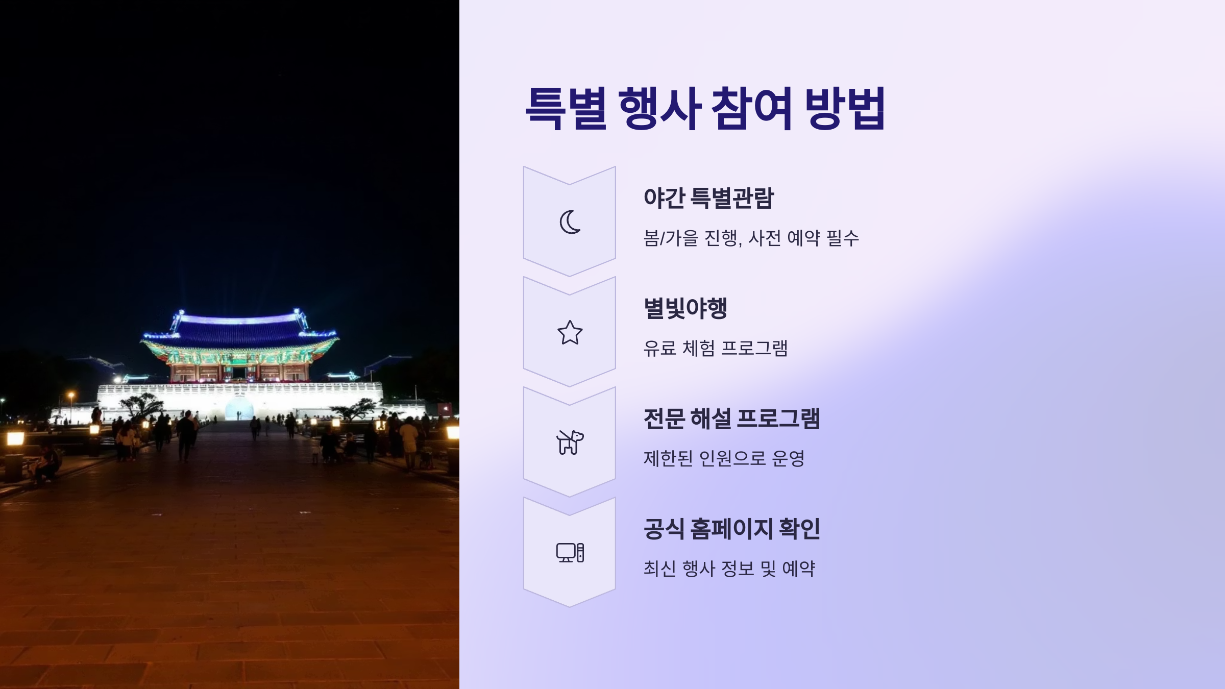 한국문화재재단 경복궁 야간 개장, 궁중문화축전 등 다양한 궁궐 활용 프로그램의 예약 및 상세 정보를 주로 담당합니다.
