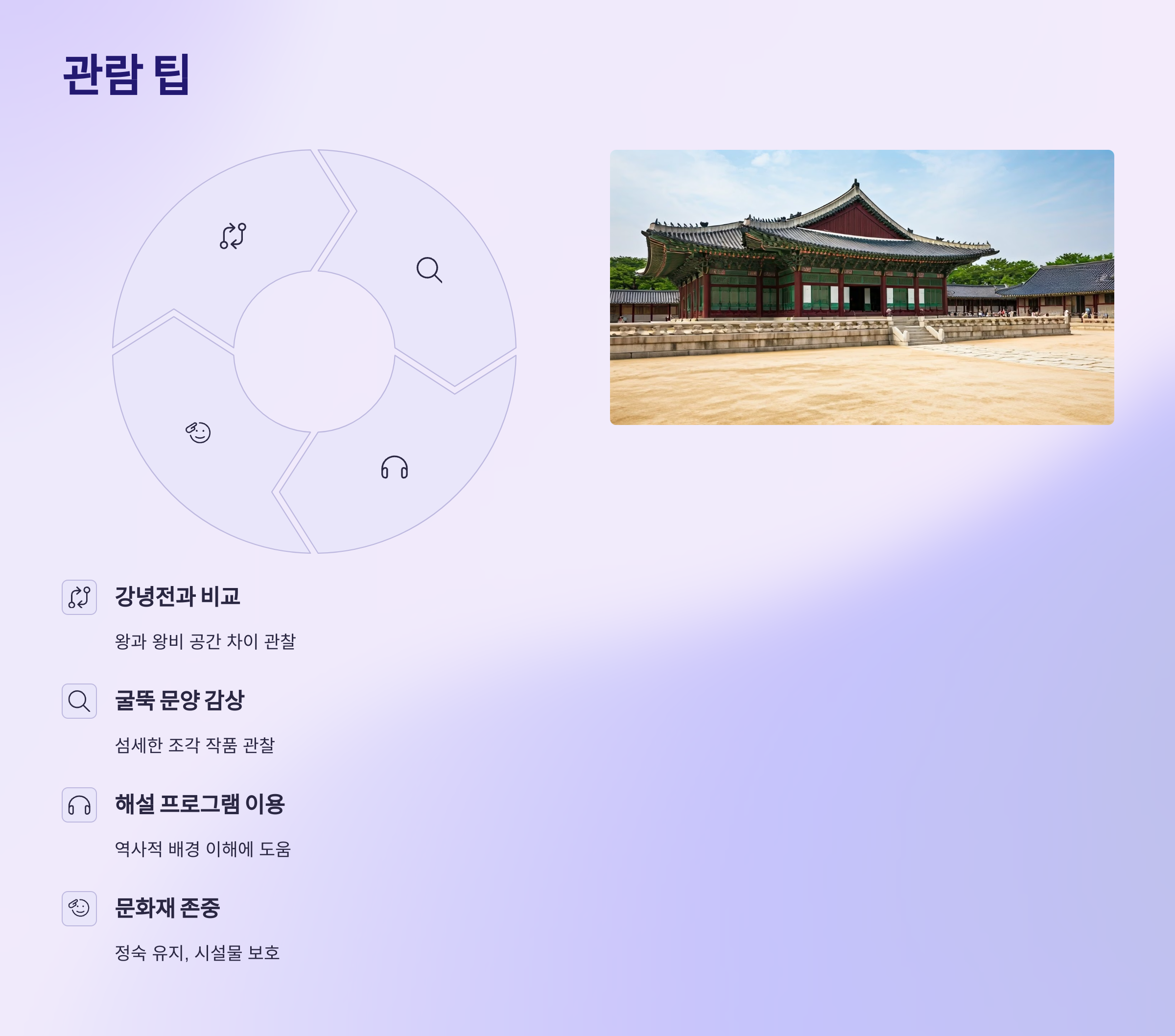 2025년에 교태전을 포함한 경복궁 방문을 계획하신다면, 방문 시점이 다가왔을 때 최신 정보를 확인하는 것이 무엇보다 중요합니다. 관람 시간, 요금, 휴궁일, 그리고 혹시 모를 특별 행사나 예약 관련 정책 변경 등은 반드시 경복궁 관리소 공식 홈페이지를 통해 확인해야 합니다. 또한, 문화재청 궁능유적본부 웹사이트나 한국문화재재단 웹사이트(특히 특별 행사)도 유용한 정보 채널이 될 수 있습니다. 교태전을 제대로 감상하기 위한 팁으로는, 먼저 왕의 공간인 강녕전과 비교하며 둘러보는 것을 추천합니다. 이후 교태전 뒤뜰로 이동하여 아미산의 아름다운 조경과 특히 보물로 지정된 굴뚝의 섬세한 문양을 자세히 살펴보세요. 각 문양이 상징하는 의미를 알고 보면 더욱 흥미로울 것입니다. 가능하다면 시간대에 맞춰 진행되는 무료 해설 프로그램을 이용하는 것도 역사를 이해하는 데 큰 도움이 됩니다. 마지막으로, 교태전은 소중한 우리의 문화유산이므로, 관람 시 정숙을 유지하고 시설물을 훼손하지 않도록 주의하는 성숙한 시민 의식이 필요합니다.