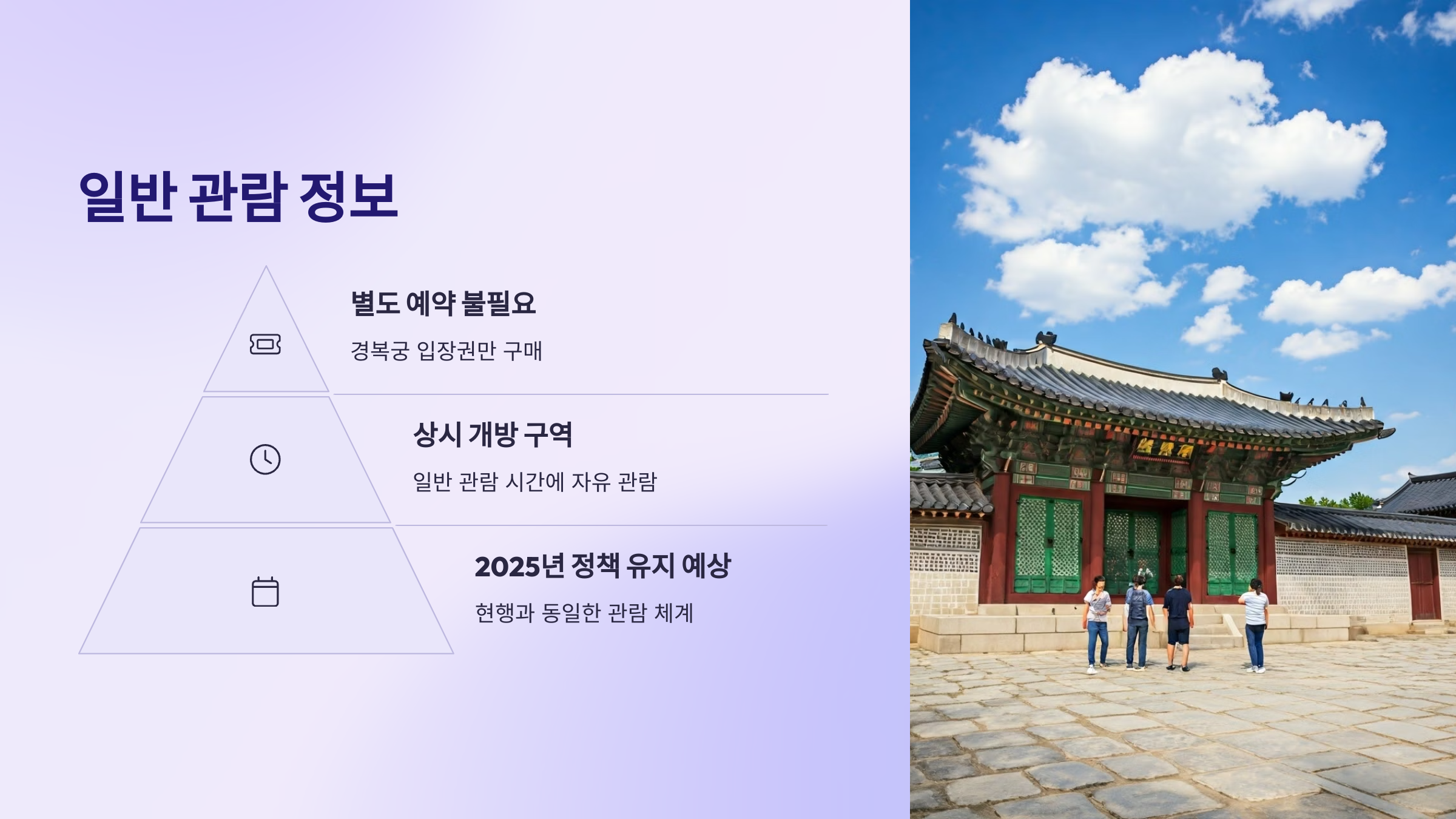 결론부터 말씀드리자면, 현재 기준으로 일반적인 주간 관람 시 경복궁 입장권만 구매하면 교태전 권역은 별도의 예약 없이 자유롭게 관람 가능합니다. 교태전은 경복궁의 상시 개방 구역에 포함되어 있기 때문입니다. 이러한 정책이 2025년에도 유지될 가능성이 높습니다. 따라서 2025년에 일반적인 낮 시간대에 경복궁을 방문하여 교태전을 둘러볼 계획이라면, 특별히 교태전만을 위한 예약을 걱정할 필요는 없을 것으로 예상됩니다. 하지만 주의해야 할 점은 '특별 행사'입니다. 예를 들어, 봄/가을에 진행되는 경복궁 야간 특별관람이나, '별빛야행'과 같은 유료 체험 프로그램, 또는 특정 시기에 진행되는 전문 해설 프로그램 등의 경우에는 반드시 사전에 별도의 예약이 필요합니다. 이러한 특별 행사들은 제한된 인원으로 진행되며, 코스에 교태전이 포함될 수 있습니다. 따라서 2025년에 이러한 특별한 경험을 원하신다면, 행사 진행 여부와 예약 방법을 반드시 해당 시점에 맞춰 공식 홈페이지 등을 통해 확인하셔야 합니다. 즉, 일반 관람은 예약 불필요, 특별 행사는 예약 필수 가능성이 높다고 정리할 수 있습니다.