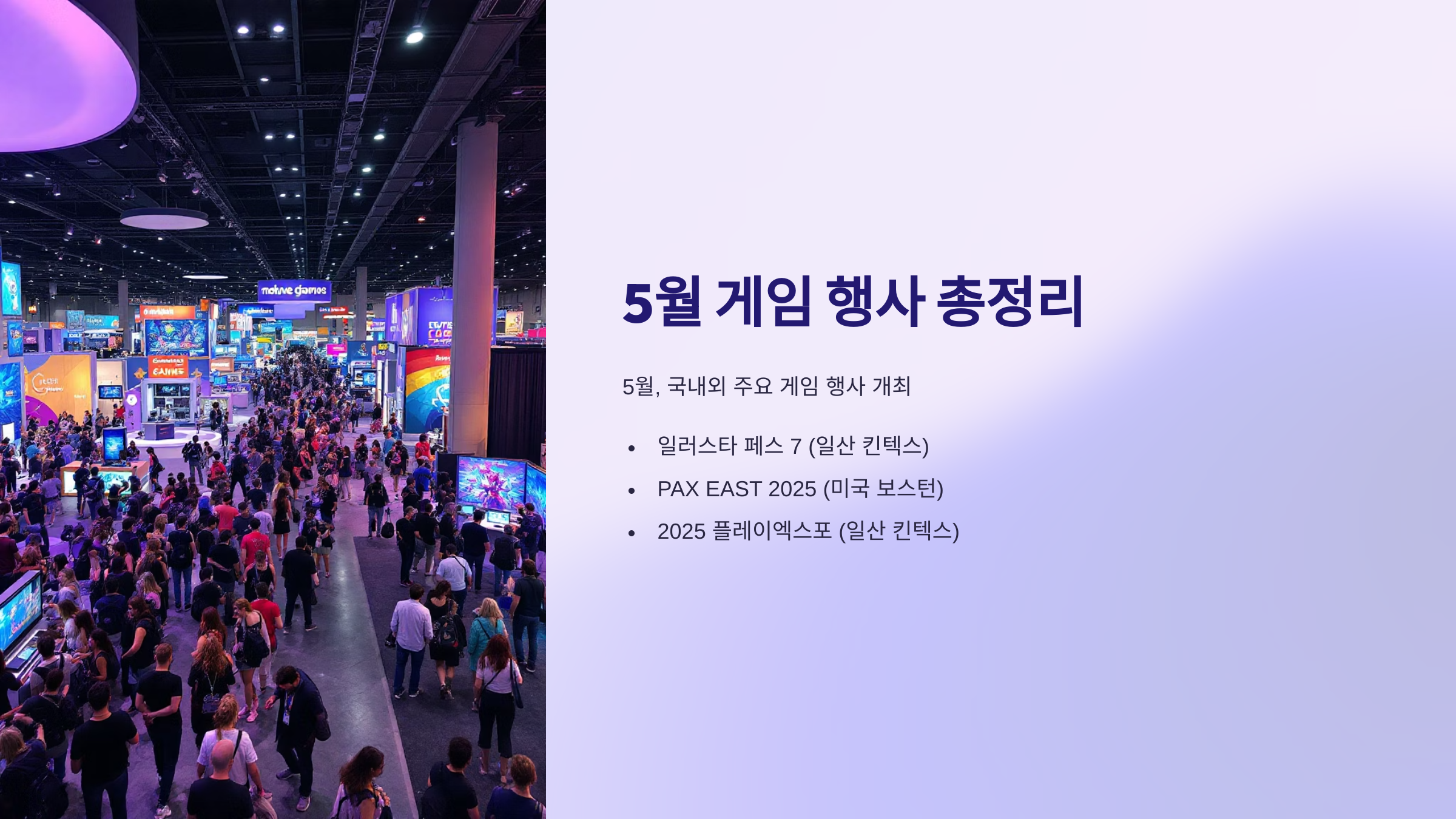 2025년 5월은 그야말로 게임 팬들에게는 축복과 같은 한 달이 될 것으로 보입니다. 국내에서는 '일러스타 페스 7'과 '2025 플레이엑스포'가 각기 다른 매력으로 서브컬처 팬들과 게임 마니아들을 사로잡을 예정이며, 해외에서는 'PAX EAST 2025'가 세계적인 게임쇼의 위용을 뽐낼 것입니다. 각 행사의 특징을 잘 파악하고, 관심 있는 분야와 취향에 맞춰 방문 계획을 세운다면 잊지 못할 5월의 추억을 만들 수 있을 것입니다. 모든 행사의 성공적인 개최를 기원하며, 게임 팬 여러분의 즐거운 관람을 응원합니다!