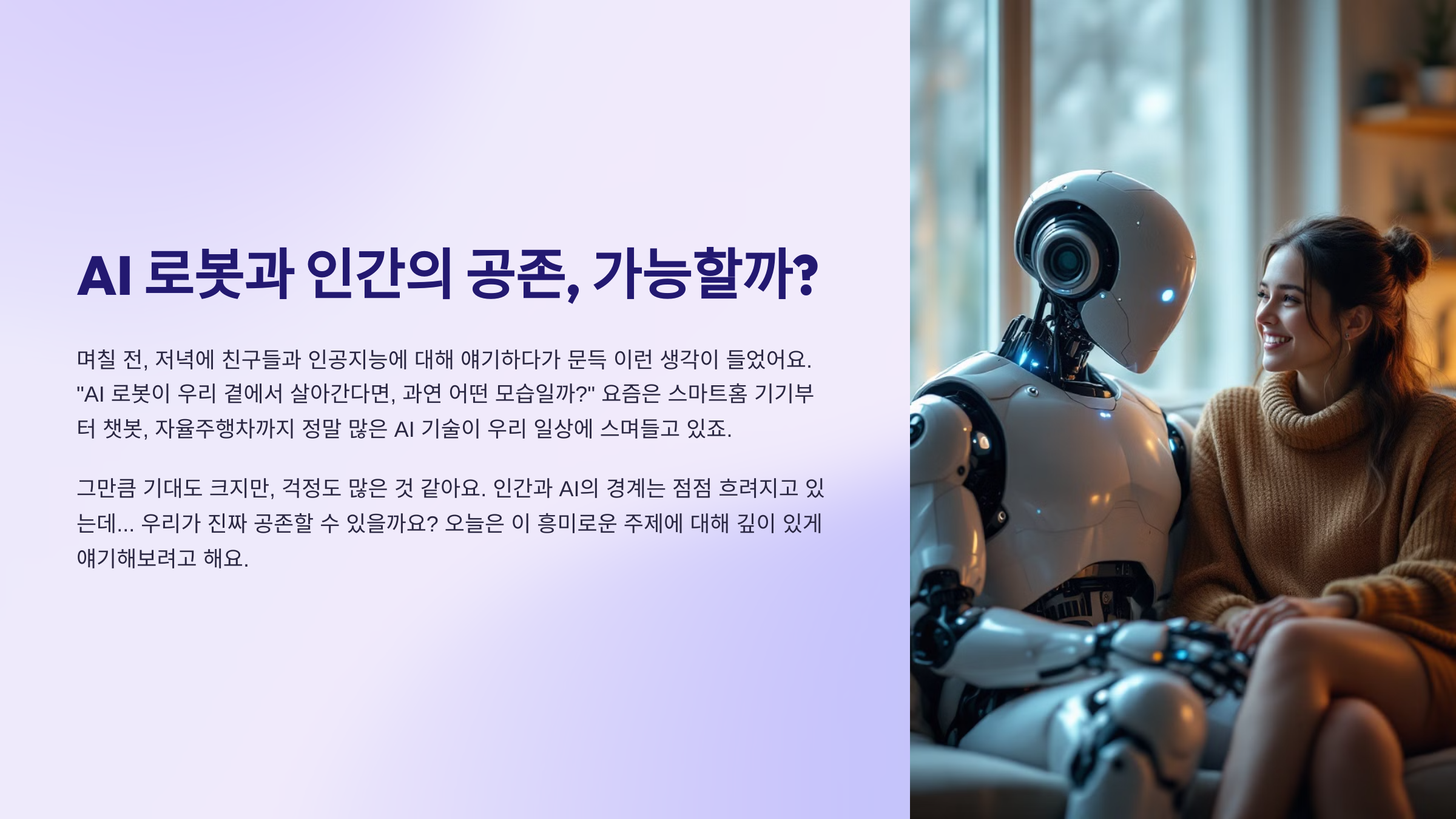 우리가 상상하던 미래가 지금 눈앞에 펼쳐지고 있어요. AI 로봇과 인간이 함께 살아가는 세상은 더 이상 영화 속 이야기가 아니죠. 하지만 중요한 건, 우리가 이 변화를 어떻게 받아들이고 준비하느냐에 달려 있어요. 너무 겁먹을 필요도, 무작정 기대할 필요도 없어요. 그냥, 조금씩 알아가고, 생각해보고, 적응해가면 되는 거예요. 여러분은 어떤 공존의 미래를 꿈꾸고 계신가요? 댓글로 생각을 나눠주세요. 같이 고민해보면 더 멋진 해답이 나올지도 몰라요!