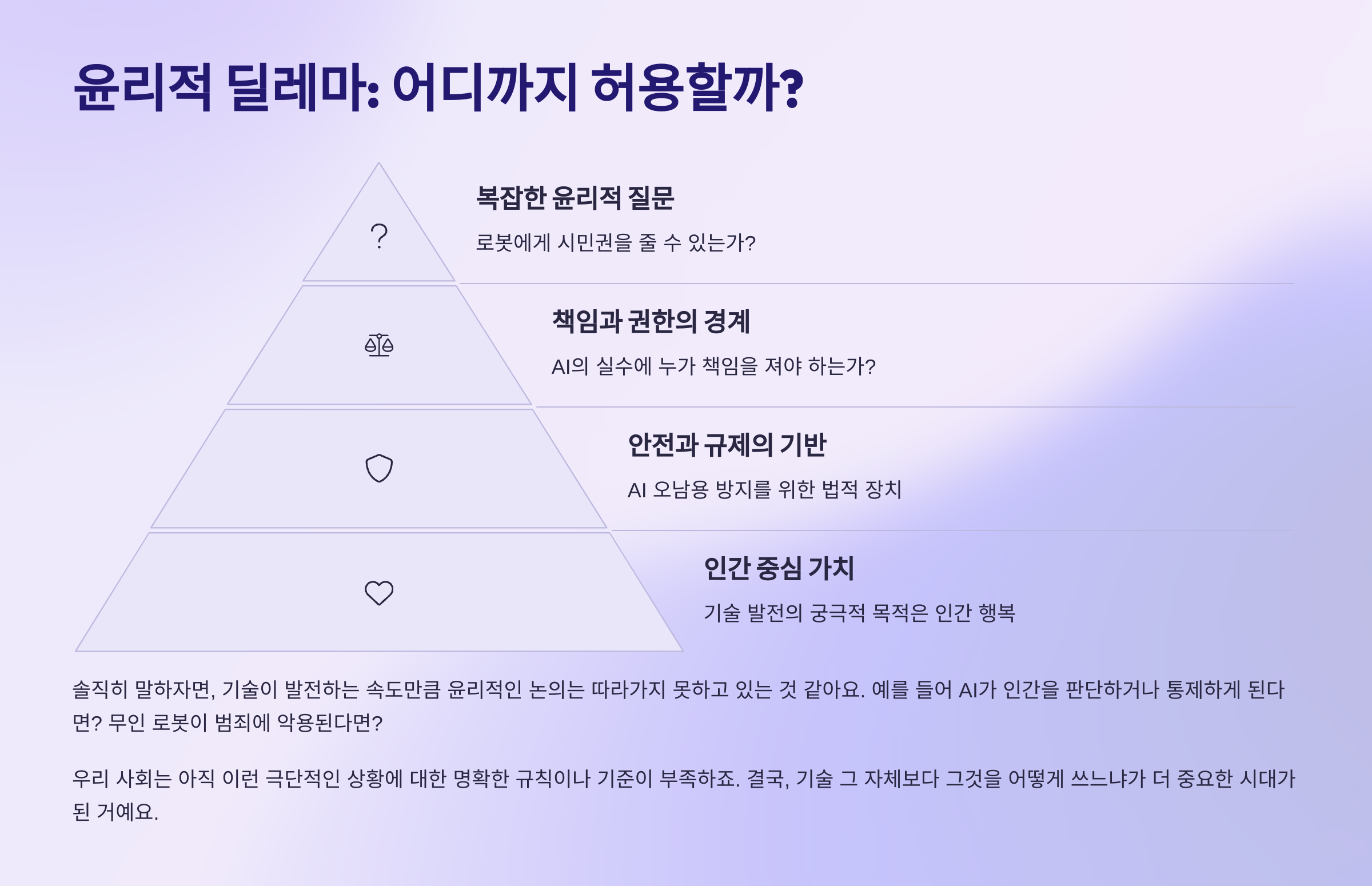 솔직히 말하자면, 기술이 발전하는 속도만큼 윤리적인 논의는 따라가지 못하고 있는 것 같아요. 예를 들어 AI가 인간을 판단하거나 통제하게 된다면? 무인 로봇이 범죄에 악용된다면? 우리 사회는 아직 이런 극단적인 상황에 대한 명확한 규칙이나 기준이 부족하죠. 로봇에게 시민권을 줄 수 있는가, AI의 실수에 책임을 물을 수 있는가 등 복잡한 딜레마가 많아요. 결국, 기술 그 자체보다 그것을 어떻게 쓰느냐가 더 중요한 시대가 된 거예요.