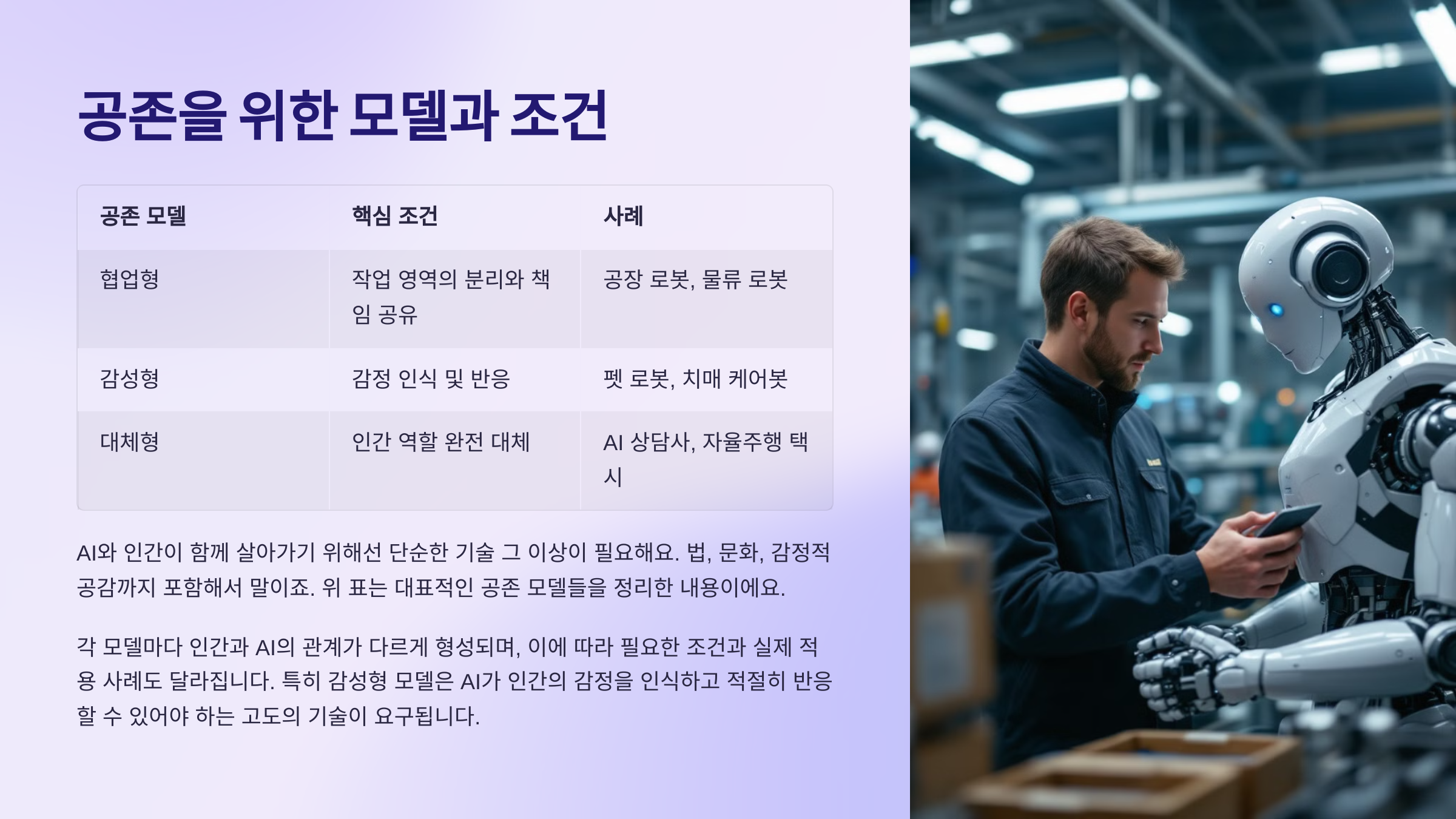 AI와 인간이 함께 살아가기 위해선 단순한 기술 그 이상이 필요해요. 법, 문화, 감정적 공감까지 포함해서 말이죠. 아래 표는 대표적인 공존 모델들을 정리한 내용이에요.