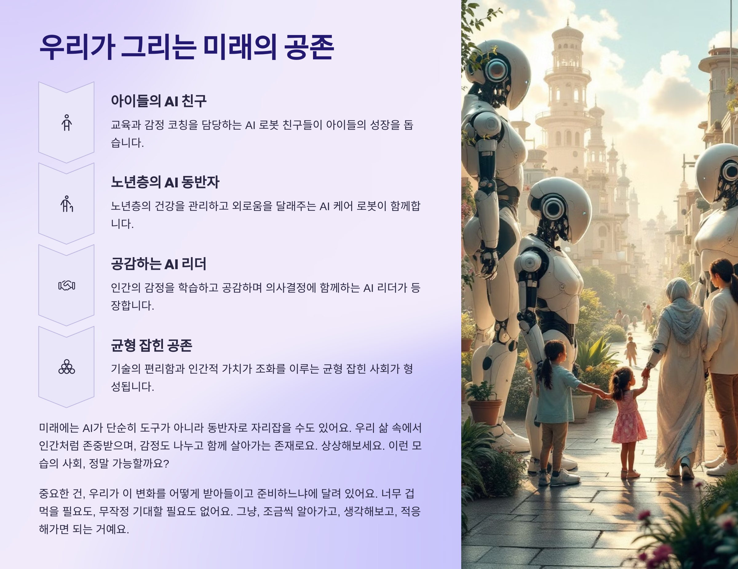 미래에는 AI가 단순히 도구가 아니라 동반자로 자리잡을 수도 있어요. 우리 삶 속에서 인간처럼 존중받으며, 감정도 나누고 함께 살아가는 존재로요. 상상해보세요. 다음과 같은 모습의 사회, 정말 가능할까요?