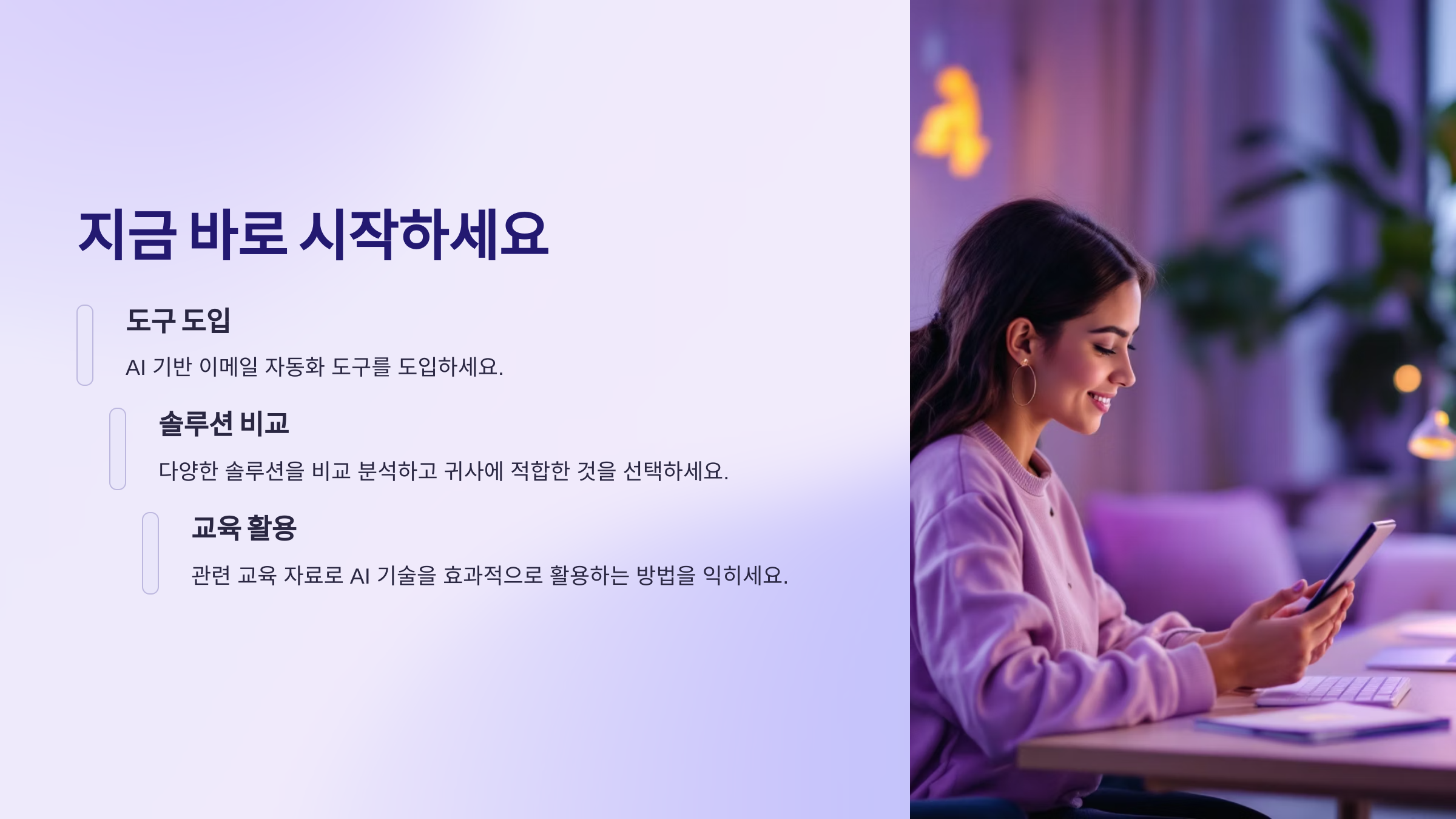 지금 바로 AI 기반 이메일 자동화 도구를 도입하여 업무 환경을 혁신하고, 시간을 효율적으로 활용하여 더 큰 성과를 달성해보세요. 다음 단계로, 다양한 AI 기반 이메일 자동화 도구를 비교 분석하고, 귀사의 업무 환경에 가장 적합한 솔루션을 선택하는 것을 추천합니다. 또한, 관련 교육 자료를 참고하여 AI 기술을 효과적으로 활용하는 방법을 익히는 것도 중요합니다.