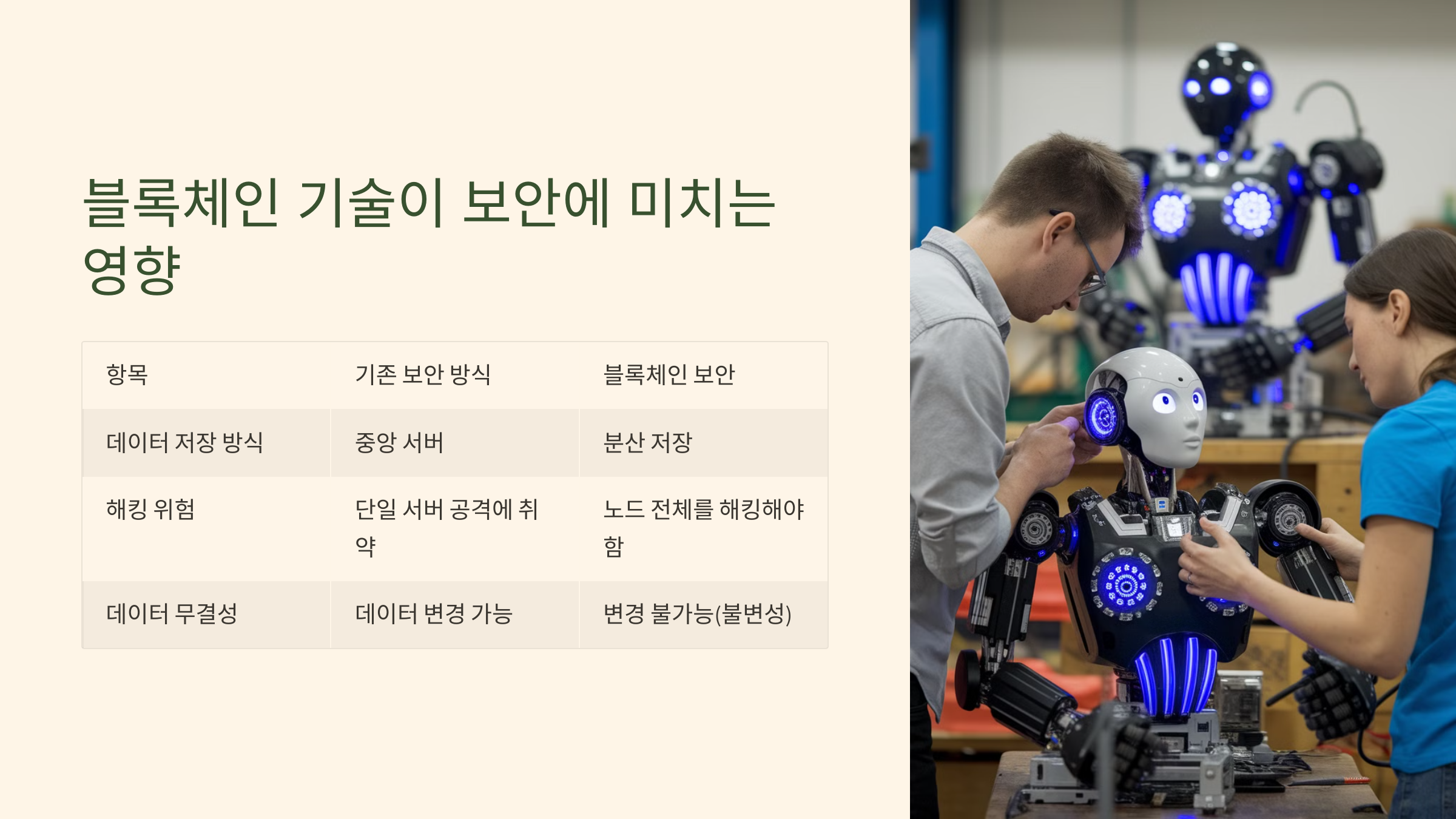 AI와 블록체인의 결합은 보안의 새로운 패러다임을 제시합니다. AI는 실시간으로 사이버 공격을 감지하고 예측할 수 있으며, 블록체인은 데이터의 무결성과 신뢰성을 보장합니다. 이러한 조합은 기존 보안 방식보다 훨씬 강력한 보호 체계를 구축할 수 있습니다.
