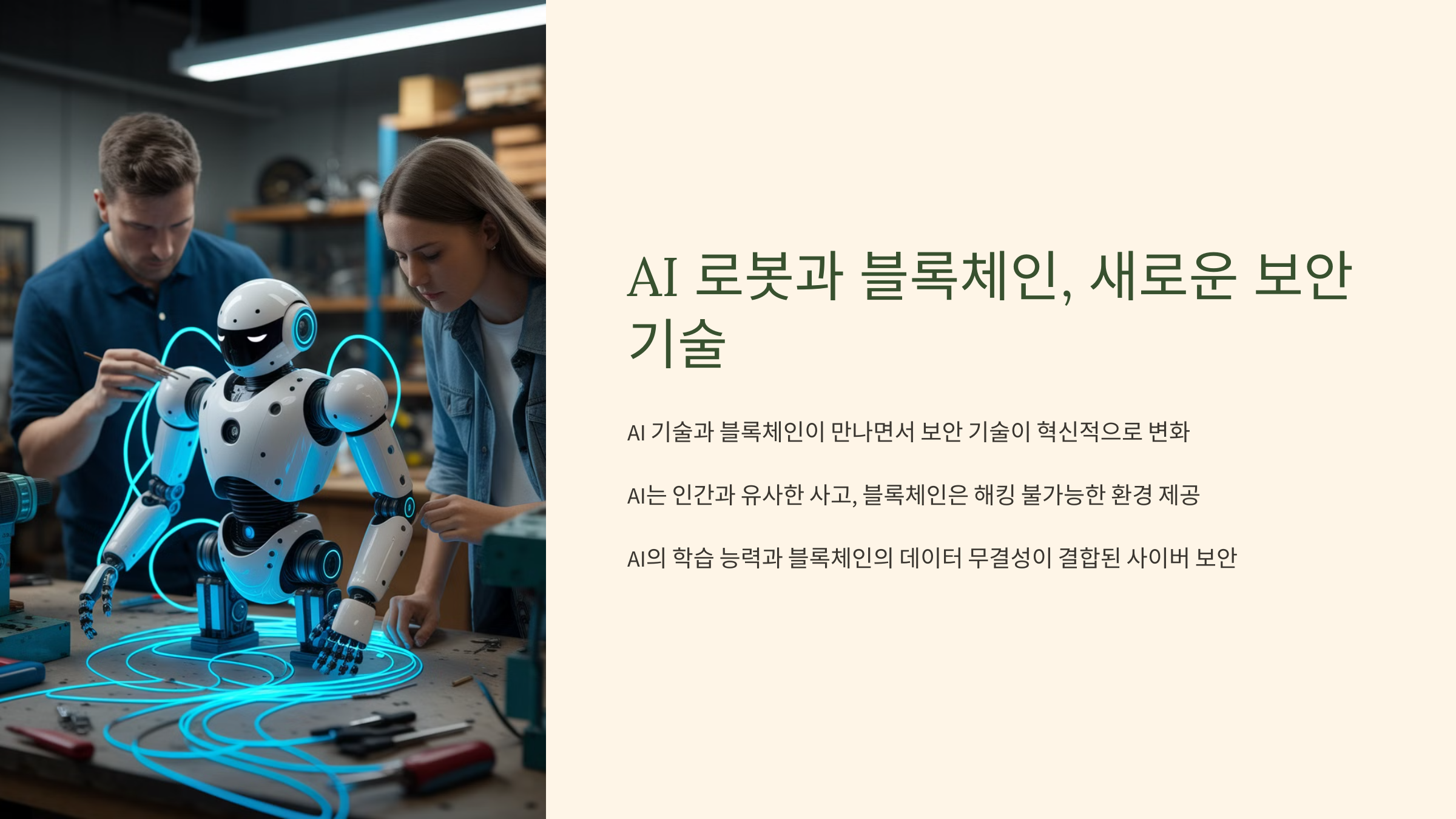 안녕하세요, 여러분! 오늘은 미래 기술의 핵심이 될 AI 로봇과 블록체인 기반 보안 기술에 대해 이야기해 보려 합니다. AI가 점점 더 인간과 유사한 사고를 하며, 블록체인은 해킹이 거의 불가능한 보안 환경을 만들고 있습니다. 특히, AI가 스스로 학습하고 보안 문제를 감지하는 방식과, 블록체인이 데이터 무결성을 보장하는 방법을 결합하면 사이버 보안이 한층 강화될 수 있습니다.