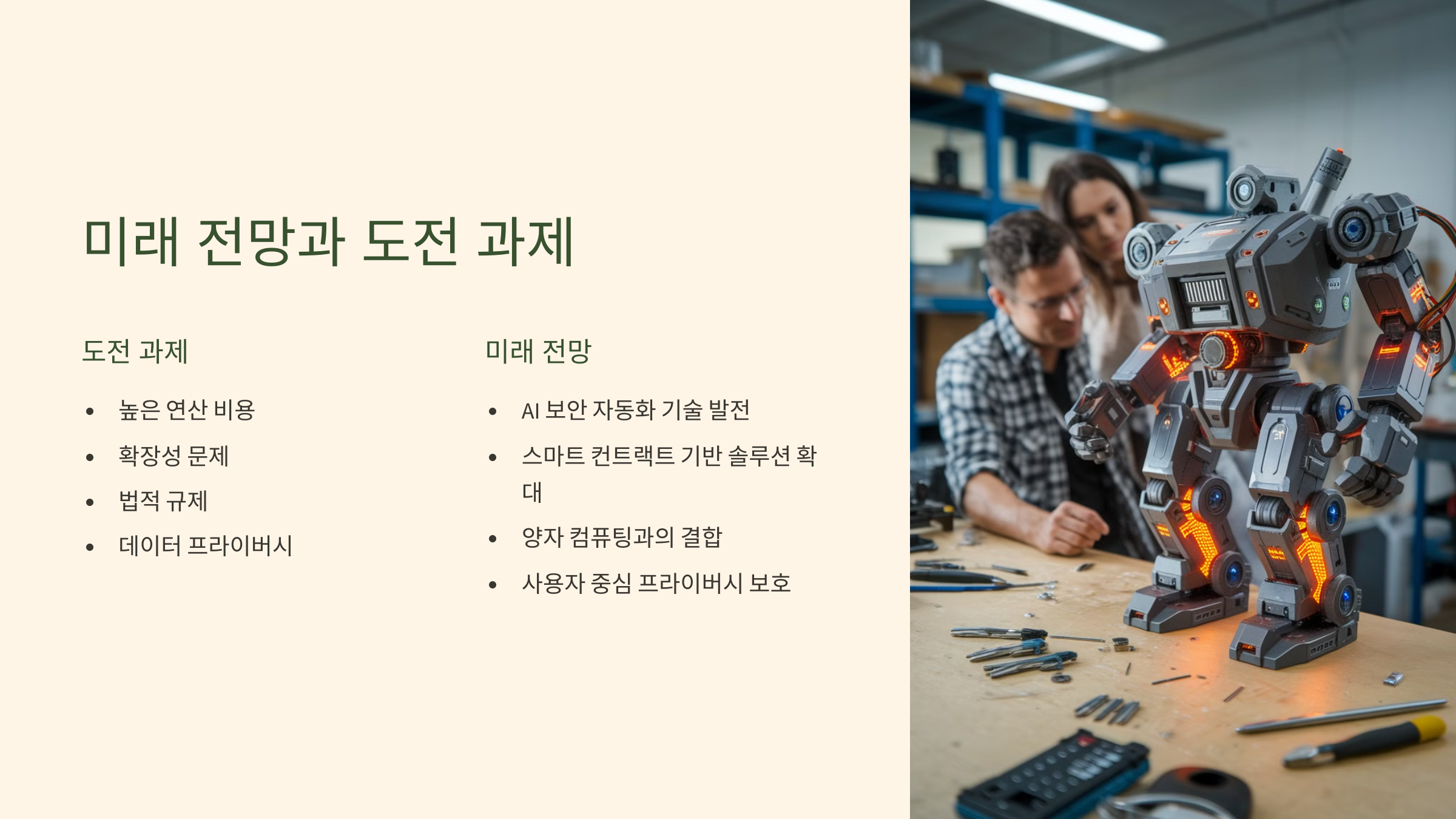 AI와 블록체인을 결합한 보안 기술은 강력하지만, 여전히 해결해야 할 문제들이 존재합니다. 특히, 계산 비용, 확장성, 규제 문제 등이 주요 도전 과제로 떠오르고 있습니다.