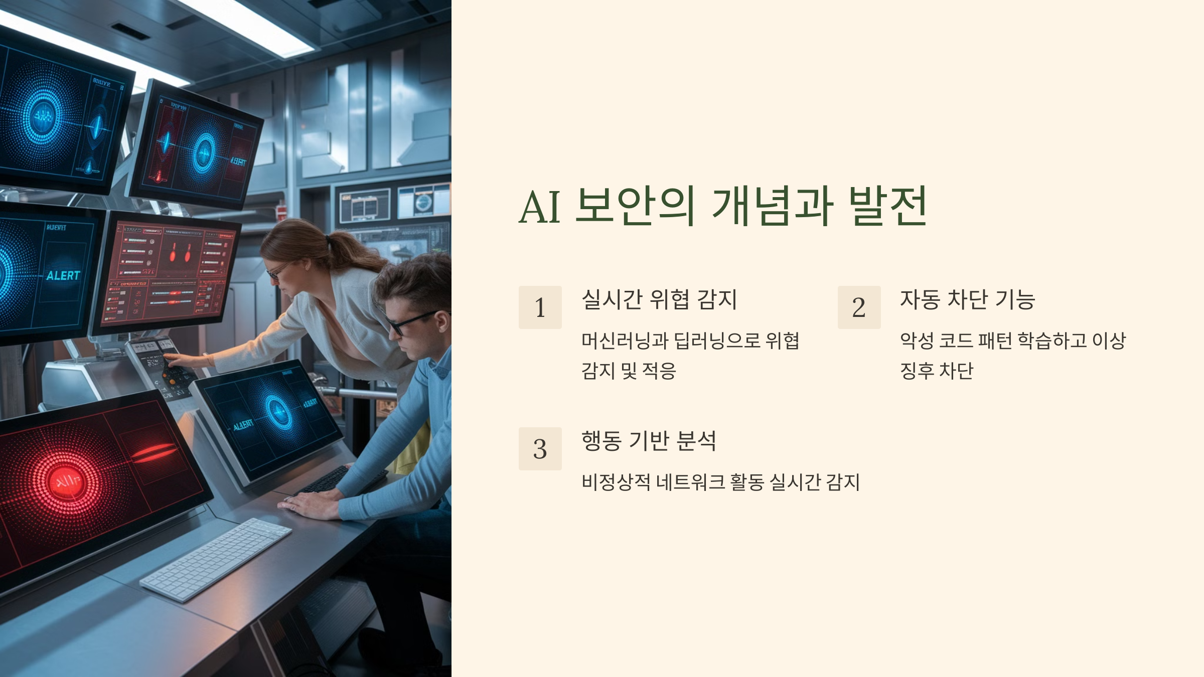 AI 보안이란 인공지능을 활용하여 사이버 위협을 탐지하고 방어하는 기술을 의미합니다. 기존 보안 시스템은 사전에 정의된 규칙을 기반으로 작동하지만, AI는 머신러닝과 딥러닝을 활용하여 실시간으로 위협을 감지하고 적응합니다. 예를 들어, AI 기반 보안 솔루션은 악성 코드 패턴을 학습하고, 이상 징후를 자동으로 감지해 차단하는 기능을 수행할 수 있습니다.