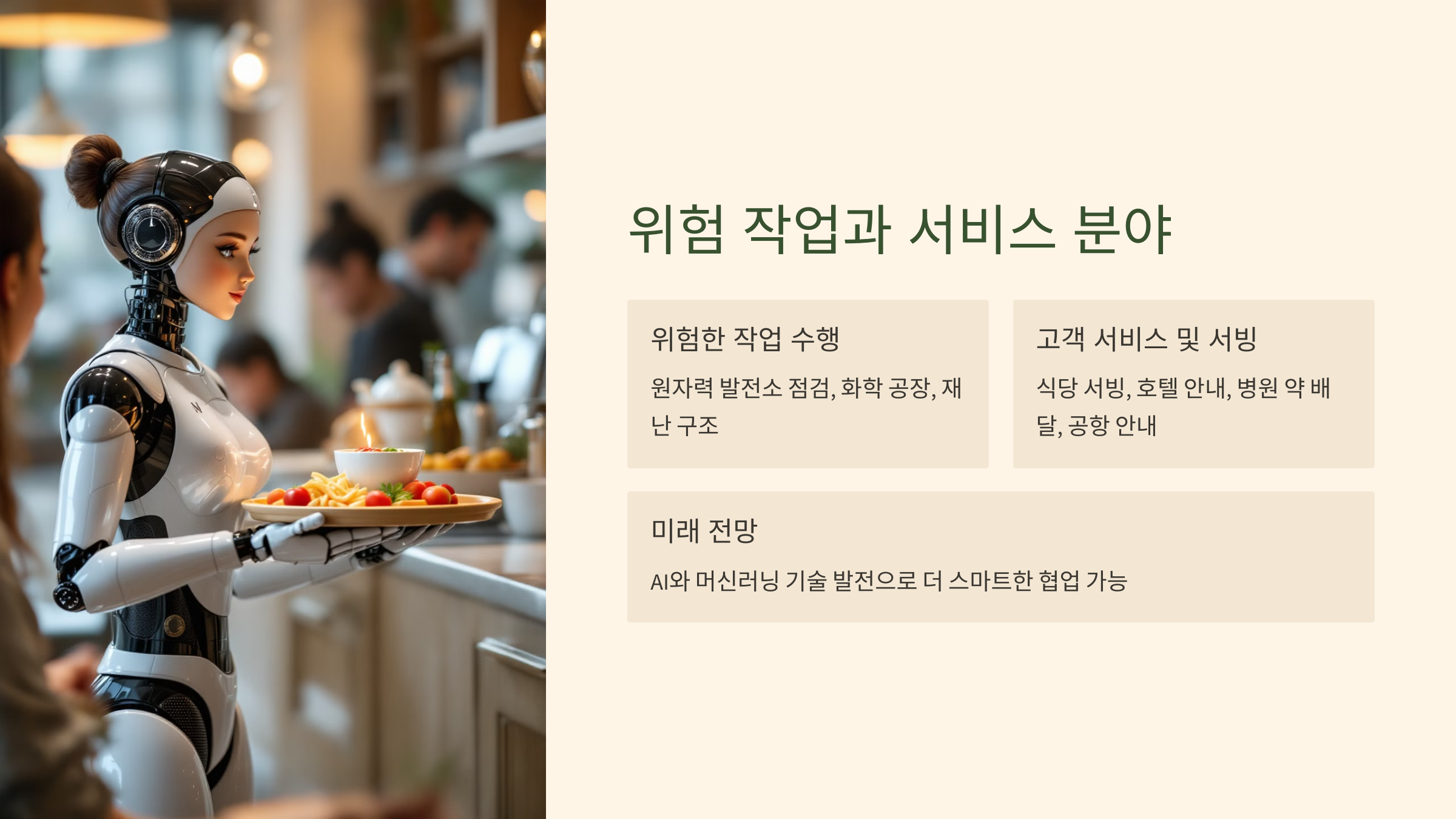 - 서빙 로봇: 식당에서 음식 서빙 및 테이블 정리 담당 (예: 배달의 민족 '딜리', '서비')