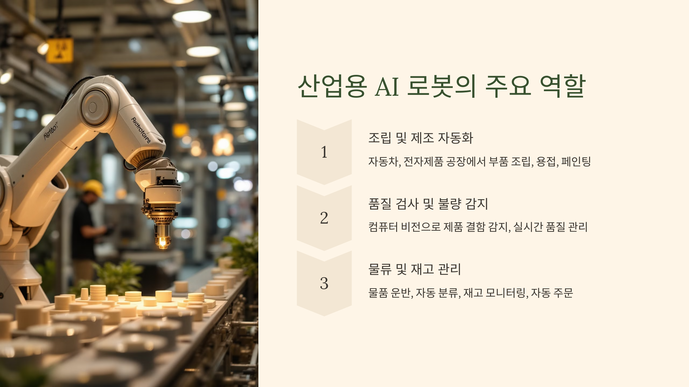 AI 로봇은 산업 현장에서 점점 더 많은 역할을 수행하며, 인류의 노동을 보조하고 생산성을 극대화하고 있습니다. 앞으로 더욱 발전된 기술이 적용되면 더 다양한 산업에서 AI 로봇의 활용도가 증가할 것입니다.