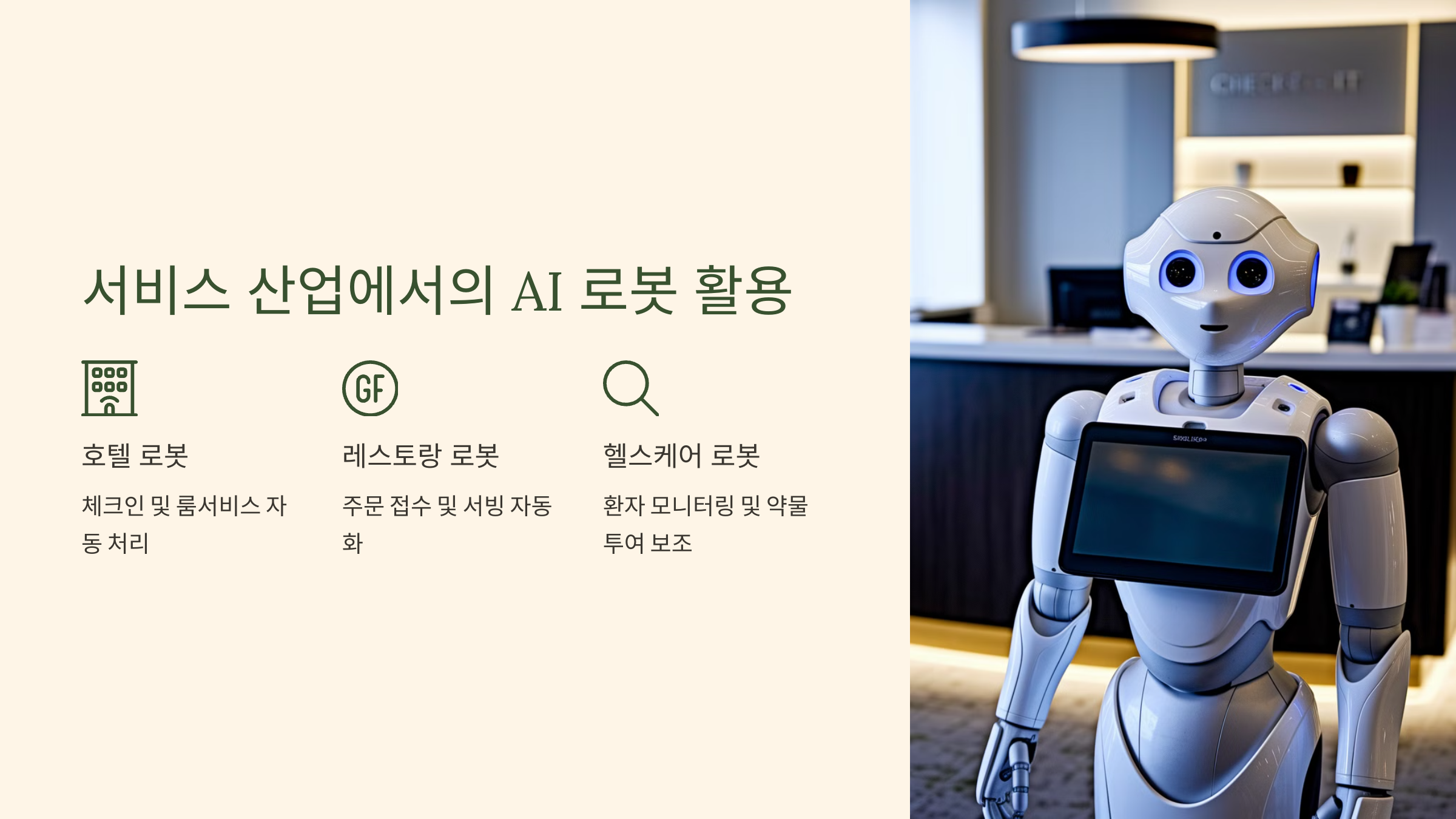AI 로봇은 고객 서비스를 더욱 효율적이고 개인화된 방식으로 변화시키고 있습니다. 호텔, 레스토랑, 병원 등 다양한 서비스 업종에서 AI 로봇이 적극 활용되고 있으며, 이는 고객 경험을 획기적으로 향상시키는 데 기여하고 있습니다.