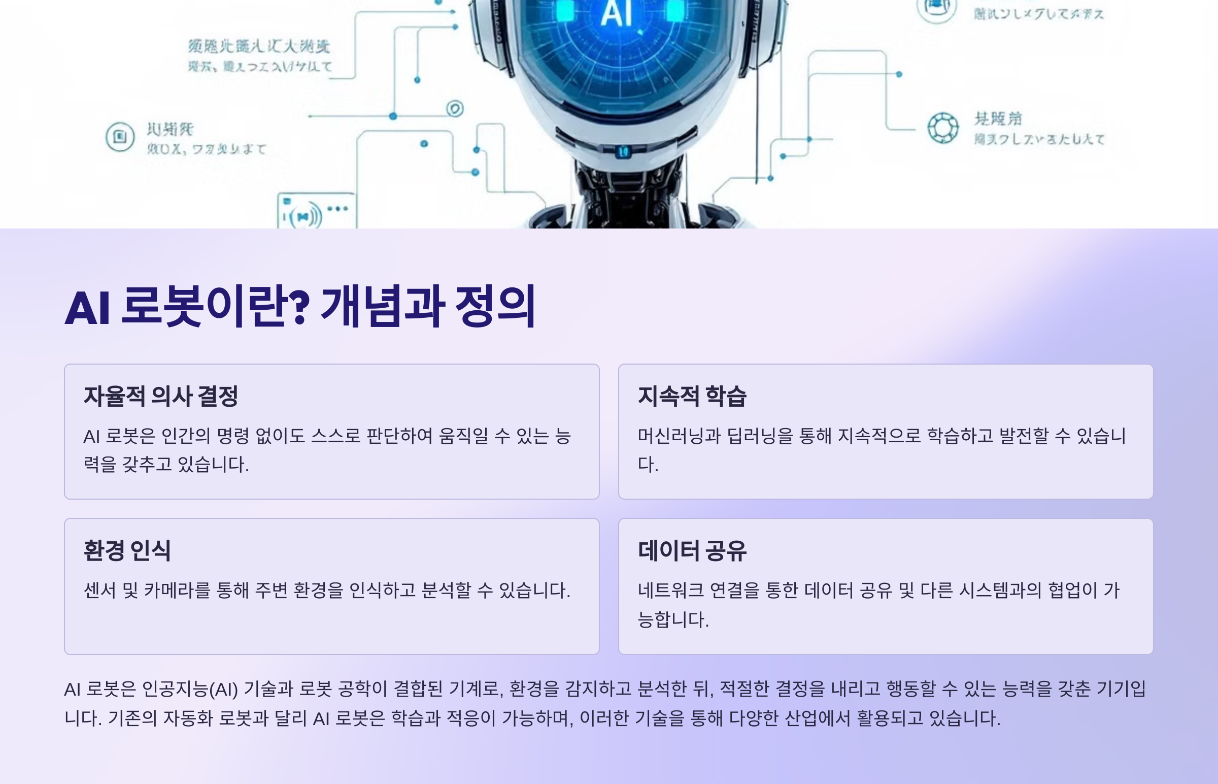 AI 로봇은 인공지능(AI) 기술과 로봇 공학이 결합된 기계로, 환경을 감지하고 분석한 뒤, 적절한 결정을 내리고 행동할 수 있는 능력을 갖춘 기기입니다. 기존의 자동화 로봇과 달리 AI 로봇은 학습과 적응이 가능하며, 인간의 명령 없이도 스스로 판단하여 움직일 수 있습니다.