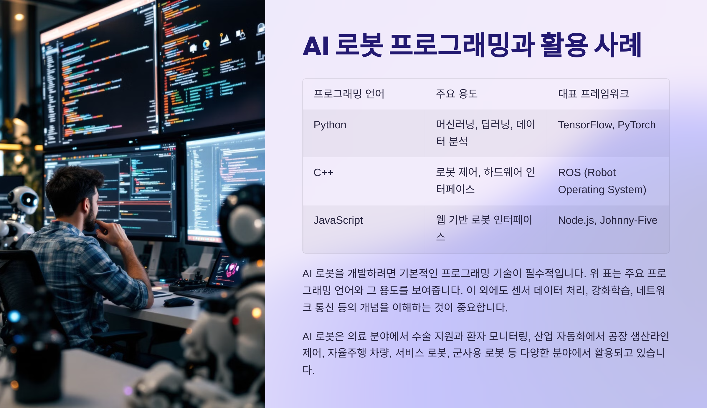 AI 로봇을 개발하려면 기본적인 프로그래밍 기술이 필수적입니다. 주요 프로그래밍 언어 및 프레임워크를 정리하면 다음과 같습니다.