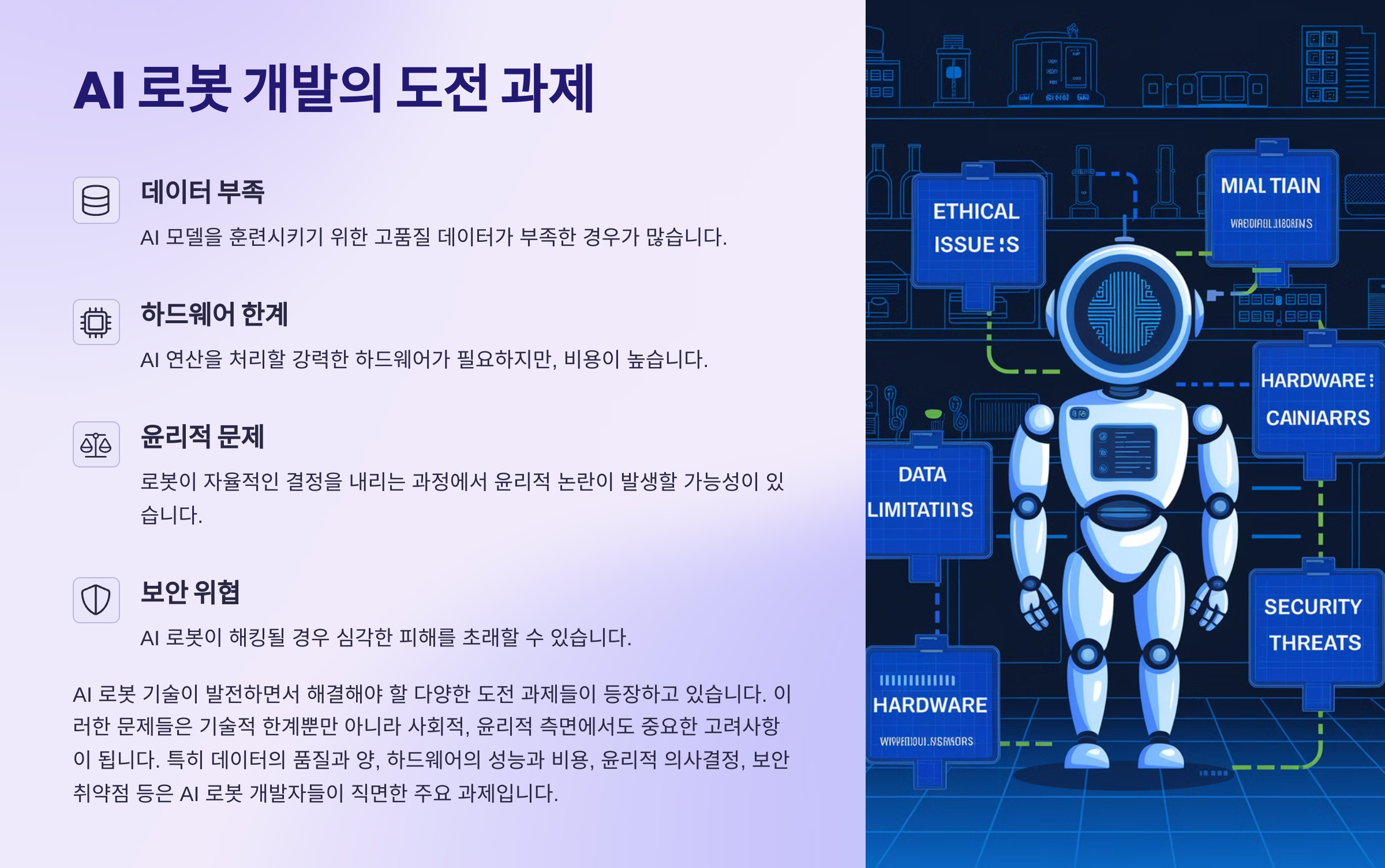 AI 로봇 기술이 발전하면서 해결해야 할 다양한 도전 과제들도 등장하고 있습니다. 대표적인 문제들은 다음과 같습니다.