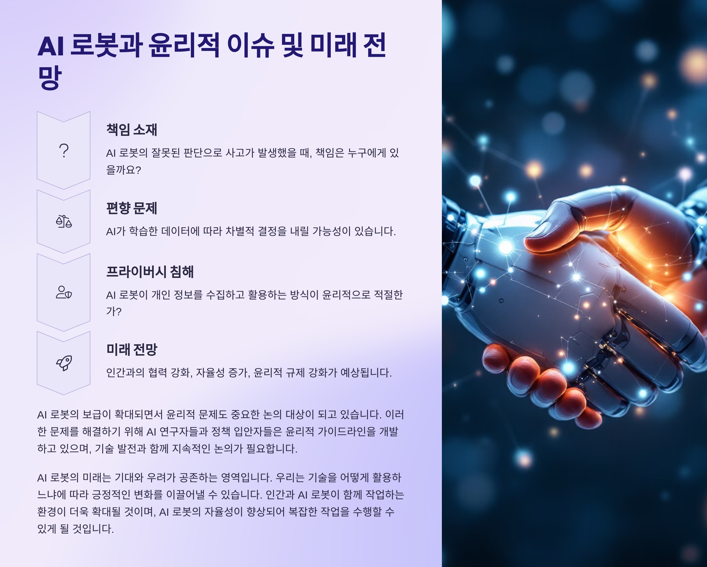 AI 로봇의 보급이 확대되면서 윤리적 문제도 중요한 논의 대상이 되고 있습니다. AI가 인간과 협력하는 과정에서 고려해야 할 윤리적 이슈들을 정리하면 다음과 같습니다.