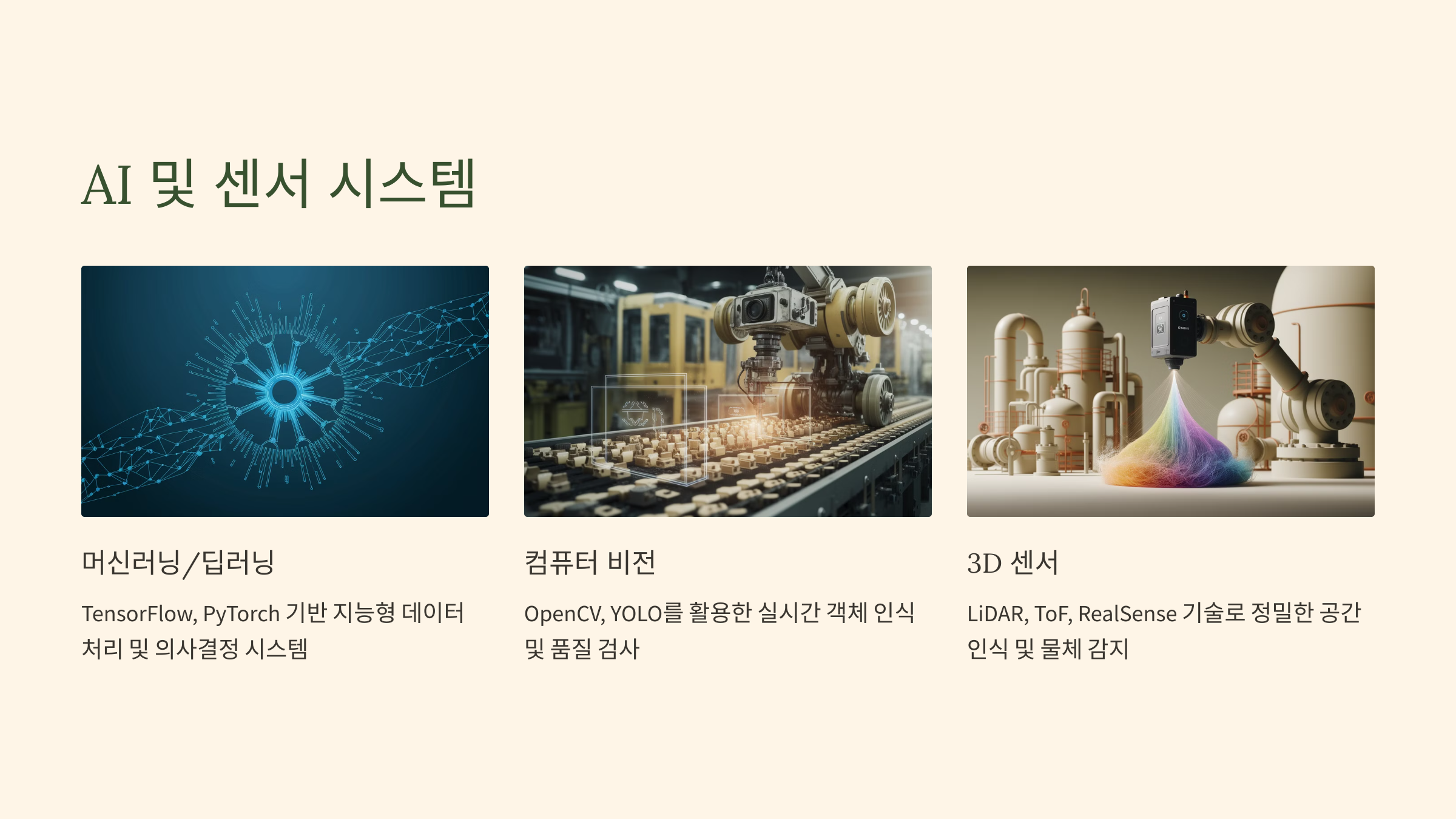 - 3D 비전 시스템 (Intel RealSense, LiDAR, ToF 센서 활용)