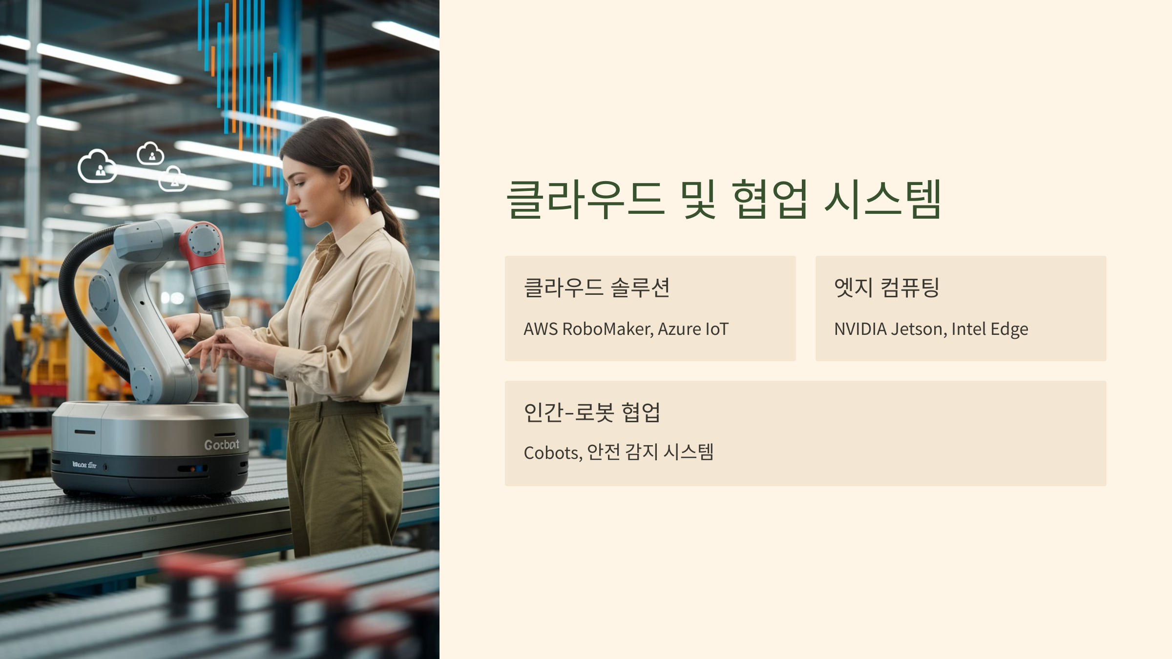 로봇 제어 시스템부터 AI 기반 분석, 클라우드 및 엣지 컴퓨팅까지 다양한 솔루션을 고려해야 합니다.