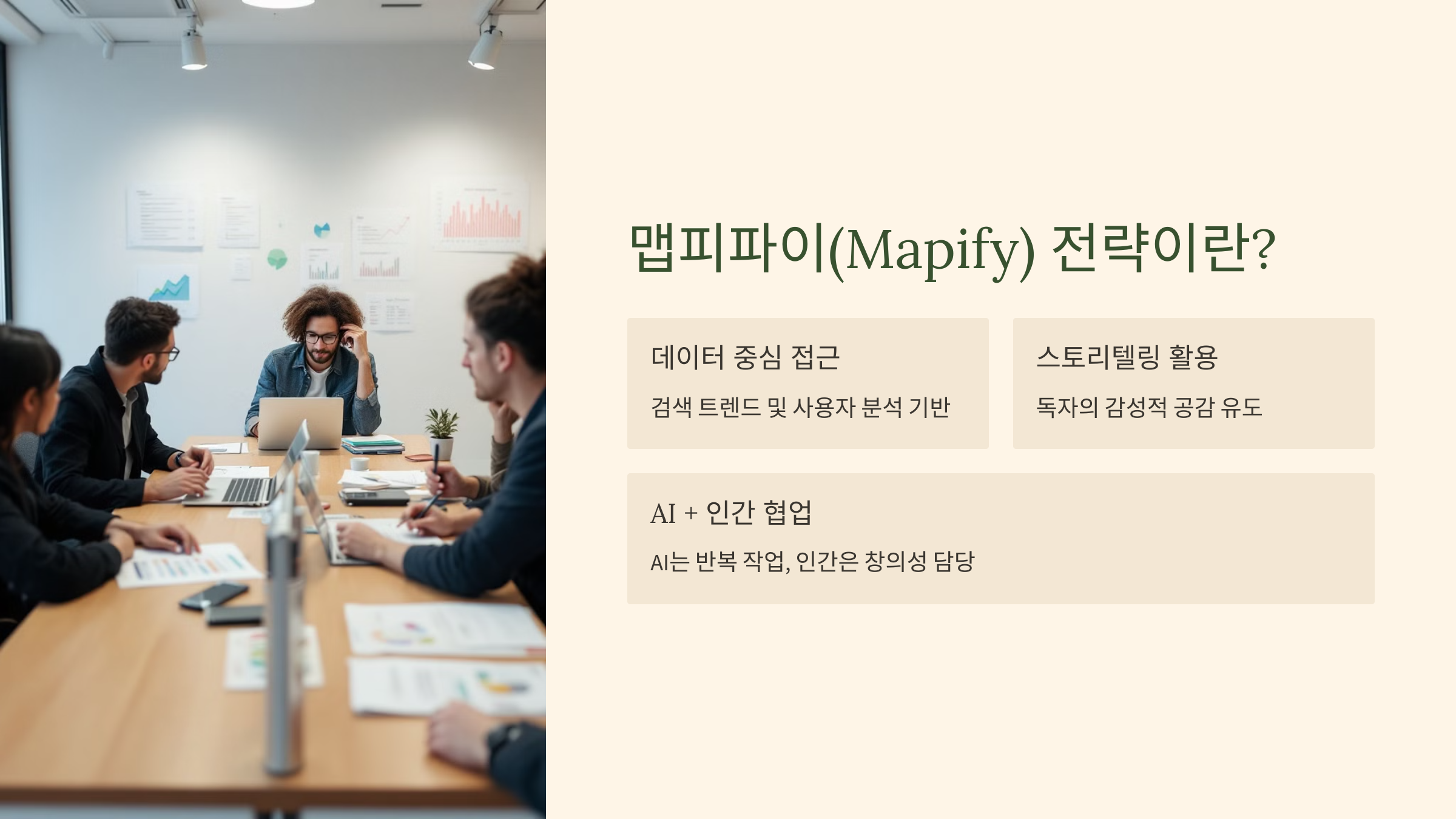 따라서 차별화된 콘텐츠를 만들기 위해서는 AI의 효율성을 활용하되, 인간적인 창의성과 깊이 있는 인사이트를 결합해야 합니다. 이런 점에서 ‘맵피파이(Mapify)’ 전략이 주목받고 있습니다. AI 시대에서도 독자들이 진정으로 원하는 콘텐츠를 제공하기 위해서는 어떤 전략이 필요할까요?
