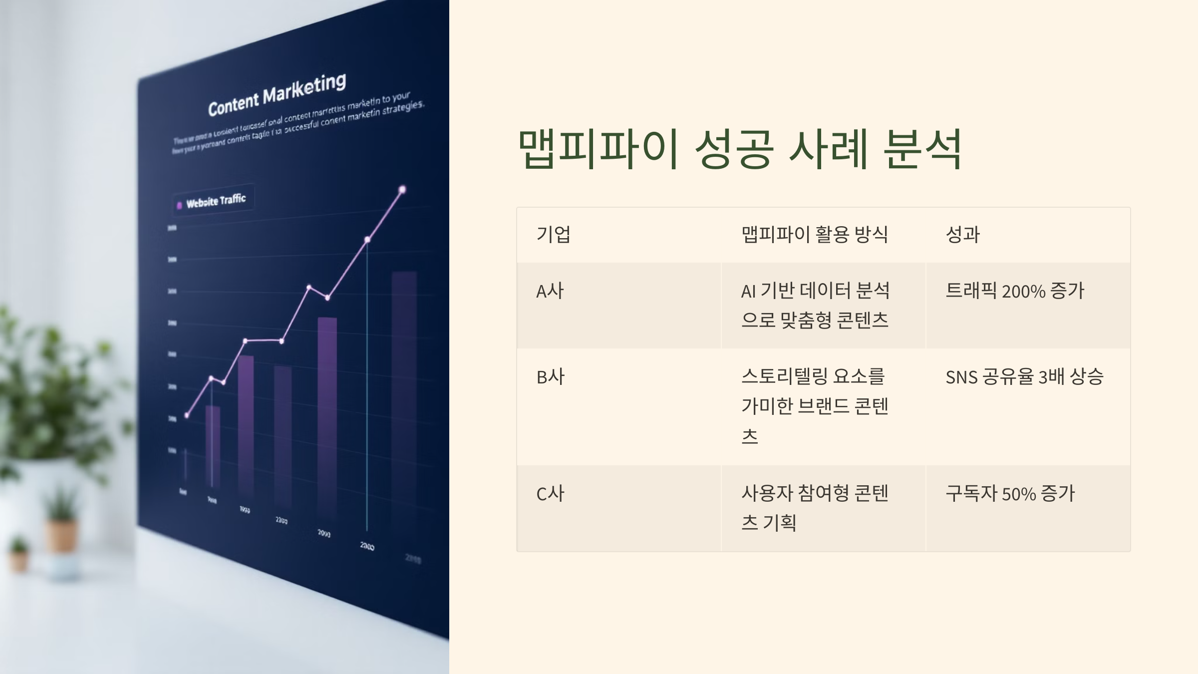 | A사 | AI 기반 데이터 분석으로 맞춤형 콘텐츠 제작 | 트래픽 200% 증가 |
