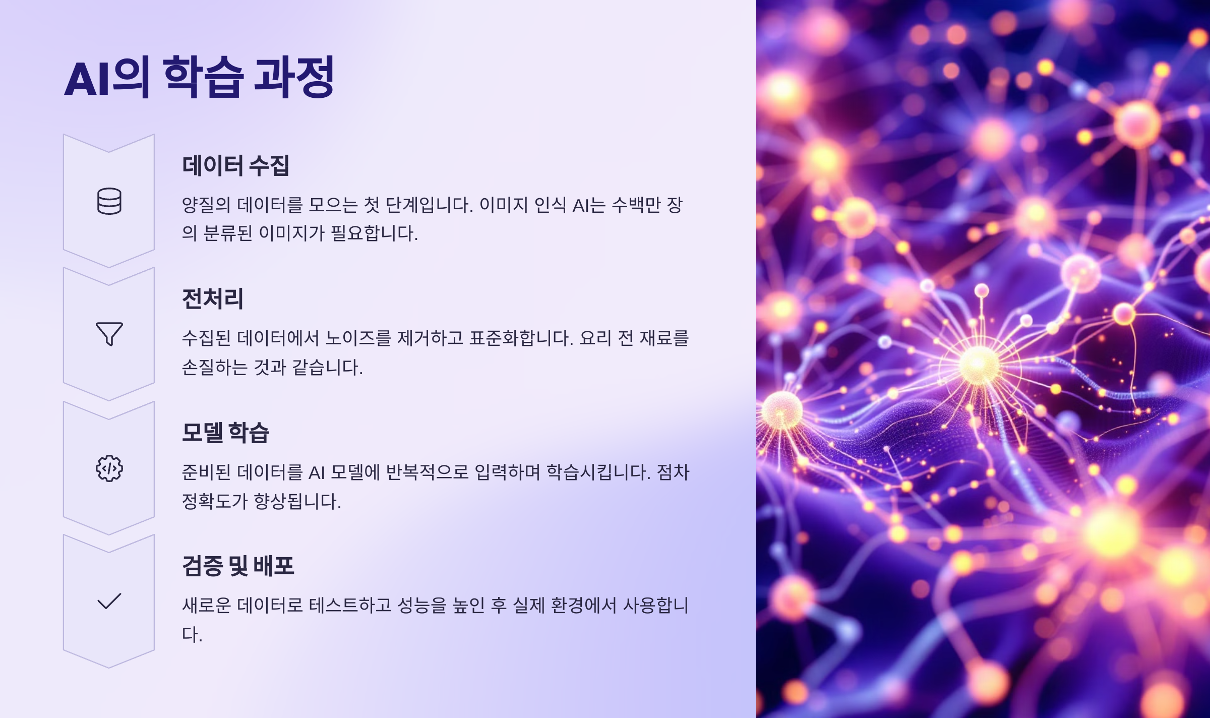 AI의 학습 과정은 마치 아이가 세상을 배워가는 과정과 비슷해요. 다만 아이는 몇 년에 걸쳐 배우는 것을 AI는 훨씬 짧은 시간에 엄청난 양의 데이터를 통해 학습합니다. 이 과정을 간략히 살펴볼까요?