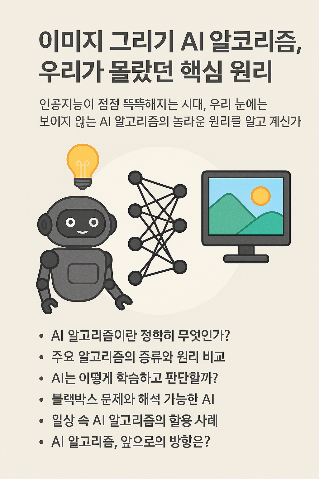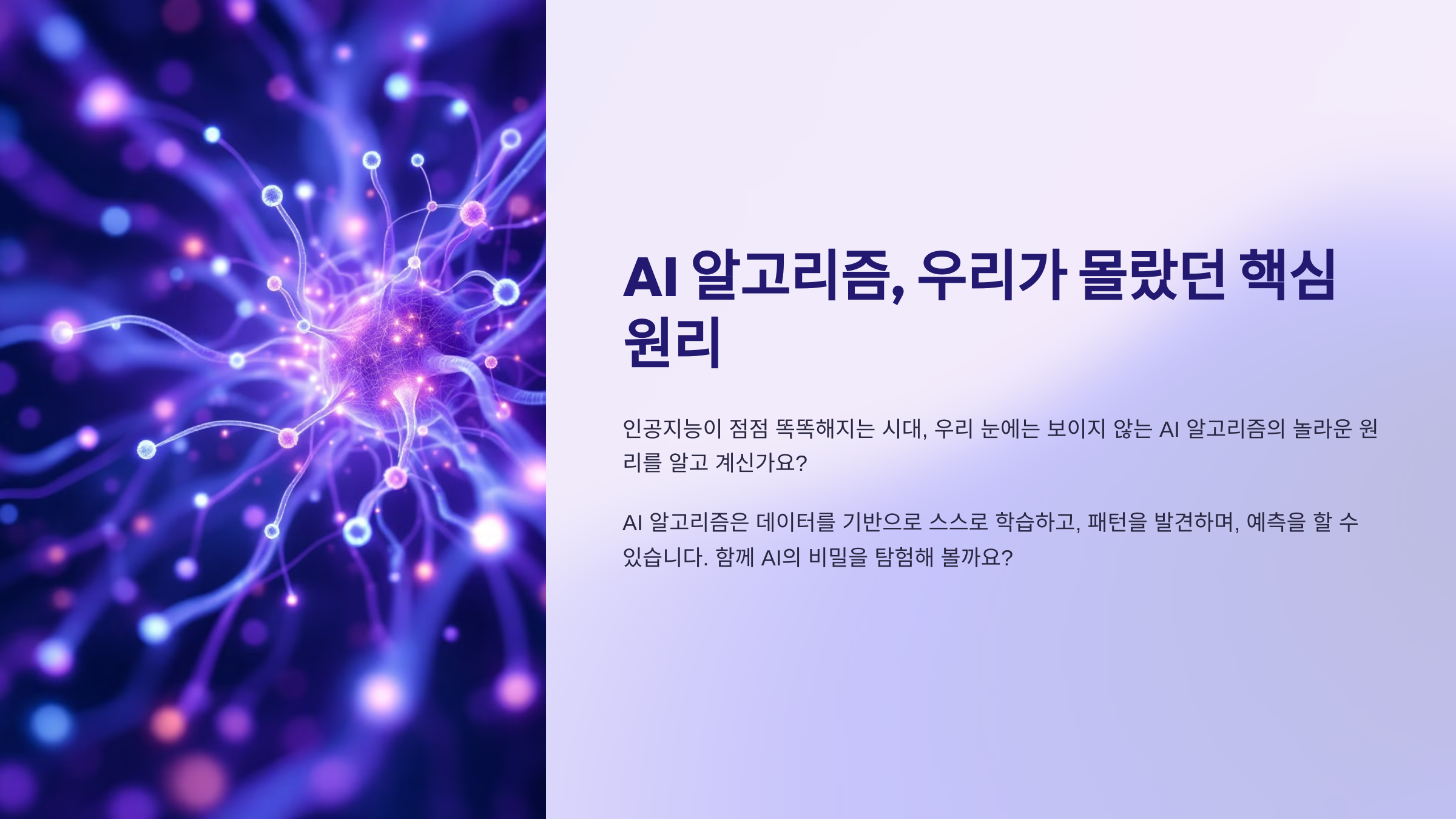 안녕하세요, 여러분. 요즘 AI가 우리 생활 곳곳에 스며들면서 많은 일을 대신해주고 있죠. 하지만 왜 AI가 그런 결정을 내리는지, 그 내부에서는 어떤 일이 벌어지고 있는지 궁금하신 적 있으신가요? 저도 처음에는 '그냥 복잡한 계산'이라고만 생각했어요. 하지만 더 깊이 들여다보니, AI 알고리즘 안에는 놀라운 원리들이 숨어 있었습니다. 오늘은 이런 AI 알고리즘의 핵심을 쉽고 재미있게 풀어볼게요. 함께 AI의 비밀을 탐험해 볼까요?