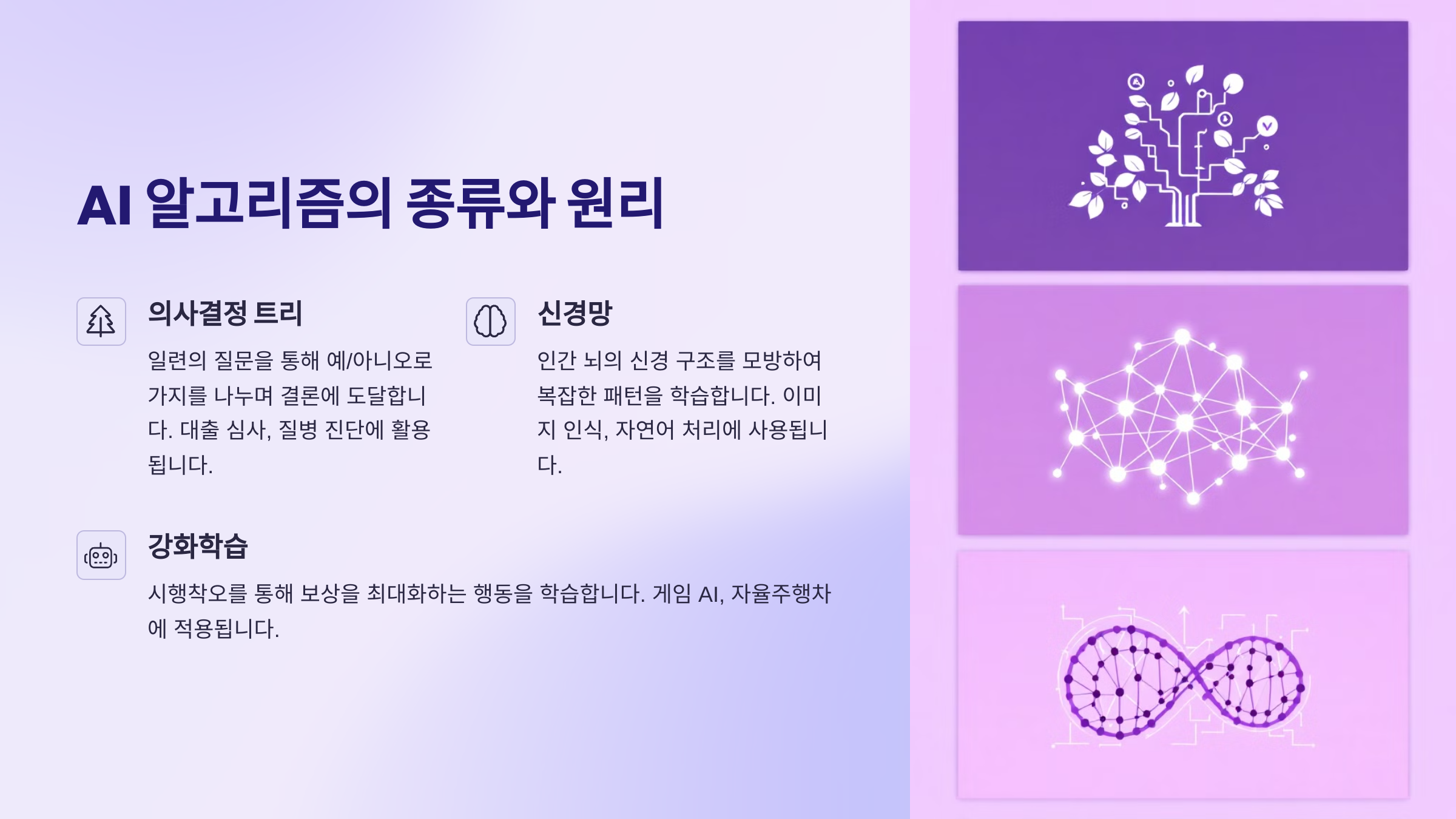 AI 알고리즘의 세계는 정말 다양합니다. 각각의 알고리즘은 특정 문제를 해결하기 위해 설계되었으며, 그 작동 방식도 제각각이에요. 대표적인 알고리즘 몇 가지를 살펴볼까요?