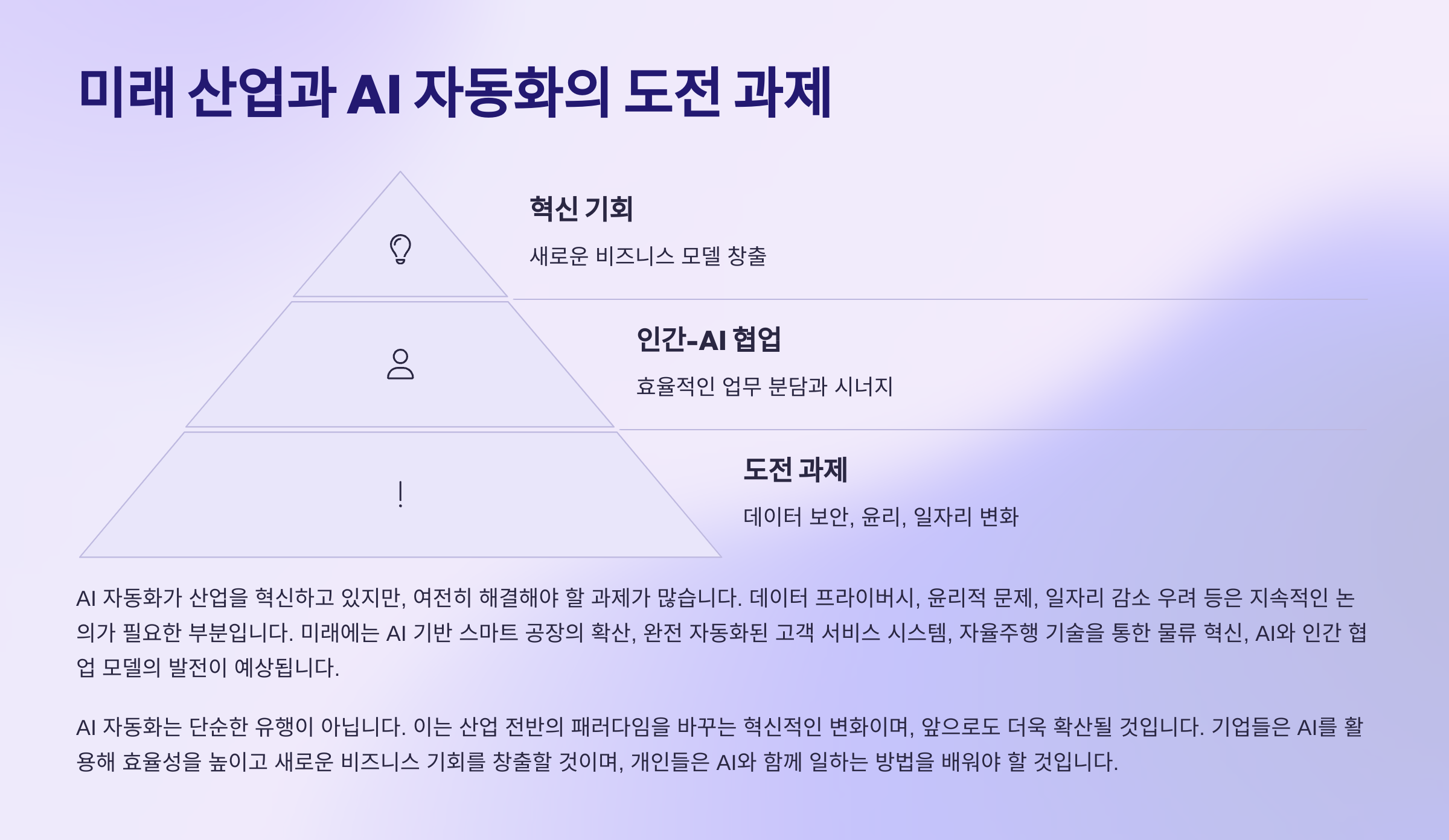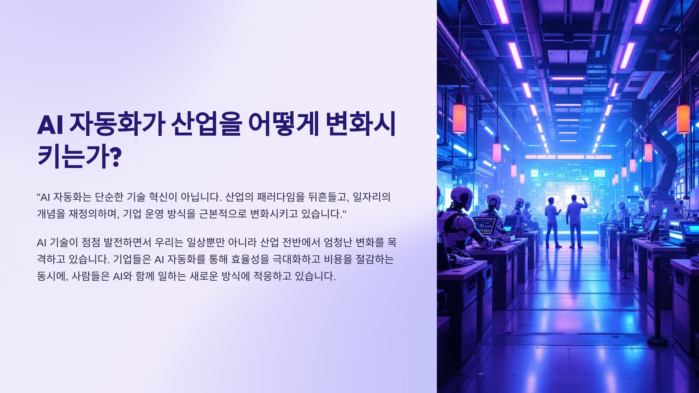 "AI 자동화는 단순한 기술 혁신이 아닙니다. 산업의 패러다임을 뒤흔들고, 일자리의 개념을 재정의하며, 기업 운영 방식을 근본적으로 변화시키고 있습니다."