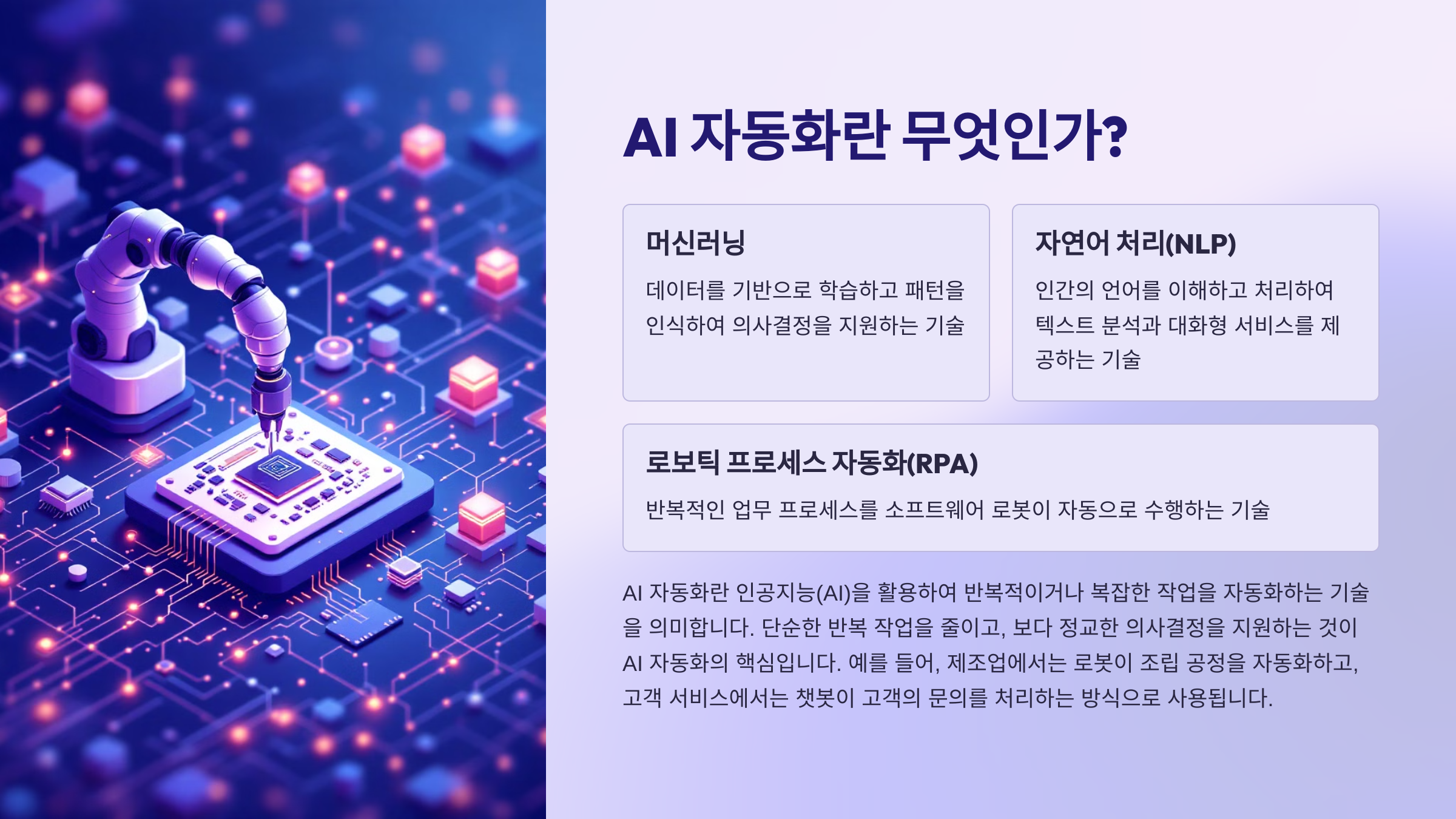 AI 자동화란 인공지능(AI)을 활용하여 반복적이거나 복잡한 작업을 자동화하는 기술을 의미합니다. 머신러닝, 자연어 처리(NLP), 로보틱 프로세스 자동화(RPA) 등의 기술이 결합되어 다양한 산업에서 활용되고 있죠. 단순한 반복 작업을 줄이고, 보다 정교한 의사결정을 지원하는 것이 AI 자동화의 핵심입니다. 예를 들어, 제조업에서는 로봇이 조립 공정을 자동화하고, 고객 서비스에서는 챗봇이 고객의 문의를 처리하는 방식으로 사용됩니다.