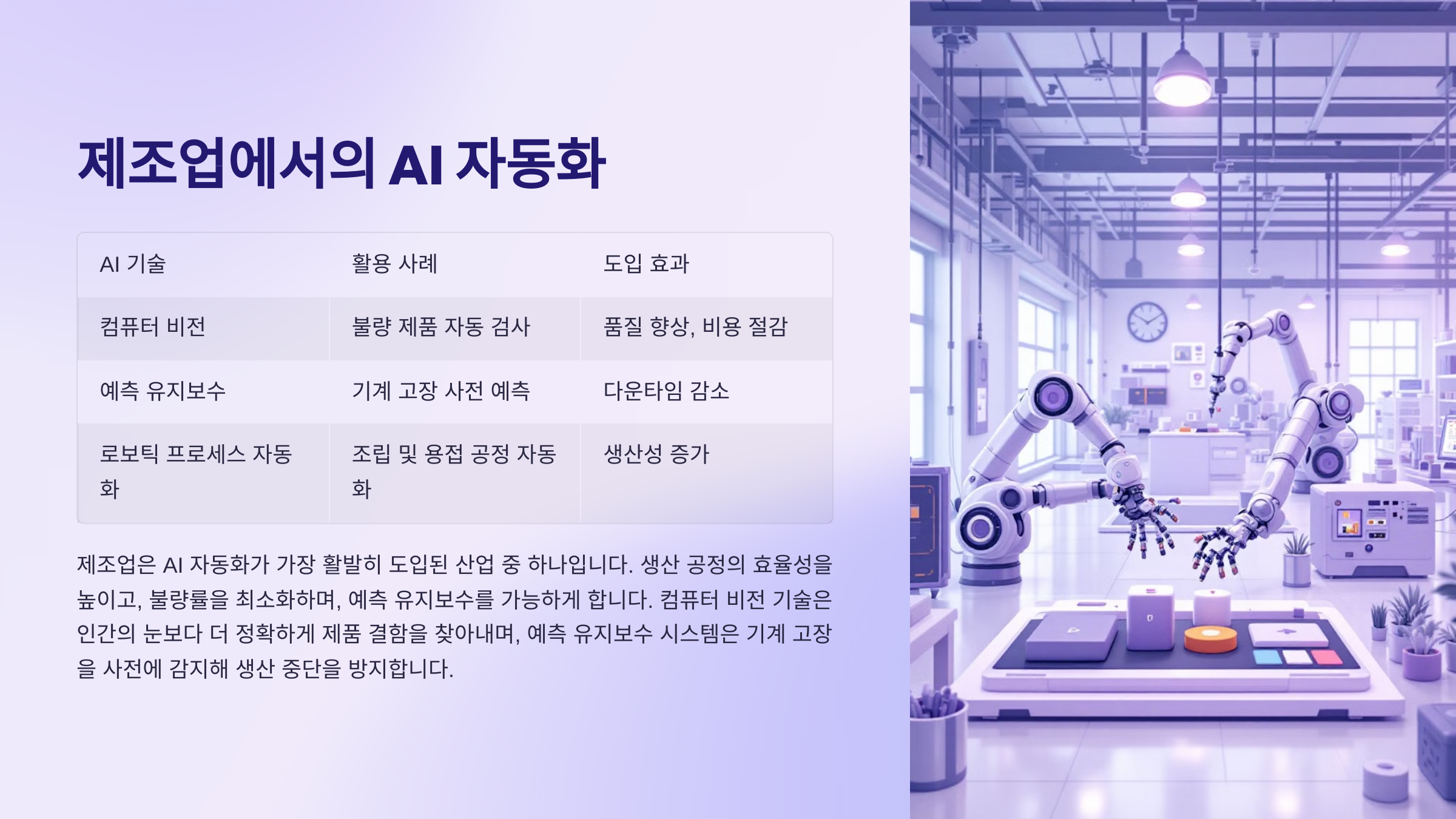 제조업은 AI 자동화가 가장 활발히 도입된 산업 중 하나입니다. 생산 공정의 효율성을 높이고, 불량률을 최소화하며, 예측 유지보수를 가능하게 합니다. 아래 표는 AI 자동화가 제조업에서 어떻게 활용되는지 보여줍니다.