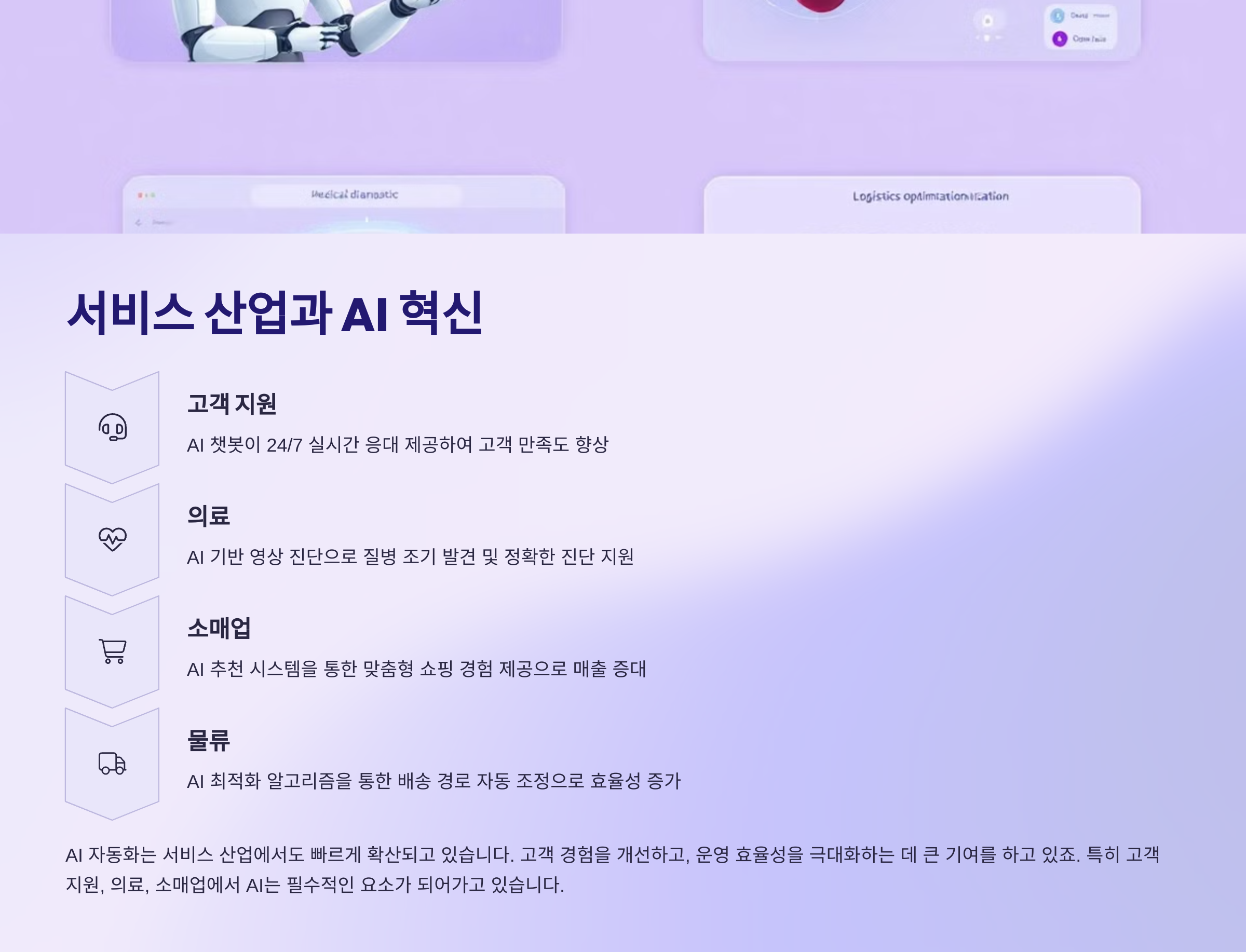 AI 자동화는 서비스 산업에서도 빠르게 확산되고 있습니다. 고객 경험을 개선하고, 운영 효율성을 극대화하는 데 큰 기여를 하고 있죠. 특히 고객 지원, 의료, 소매업에서 AI는 필수적인 요소가 되어가고 있습니다. 다음은 주요 활용 사례들입니다.