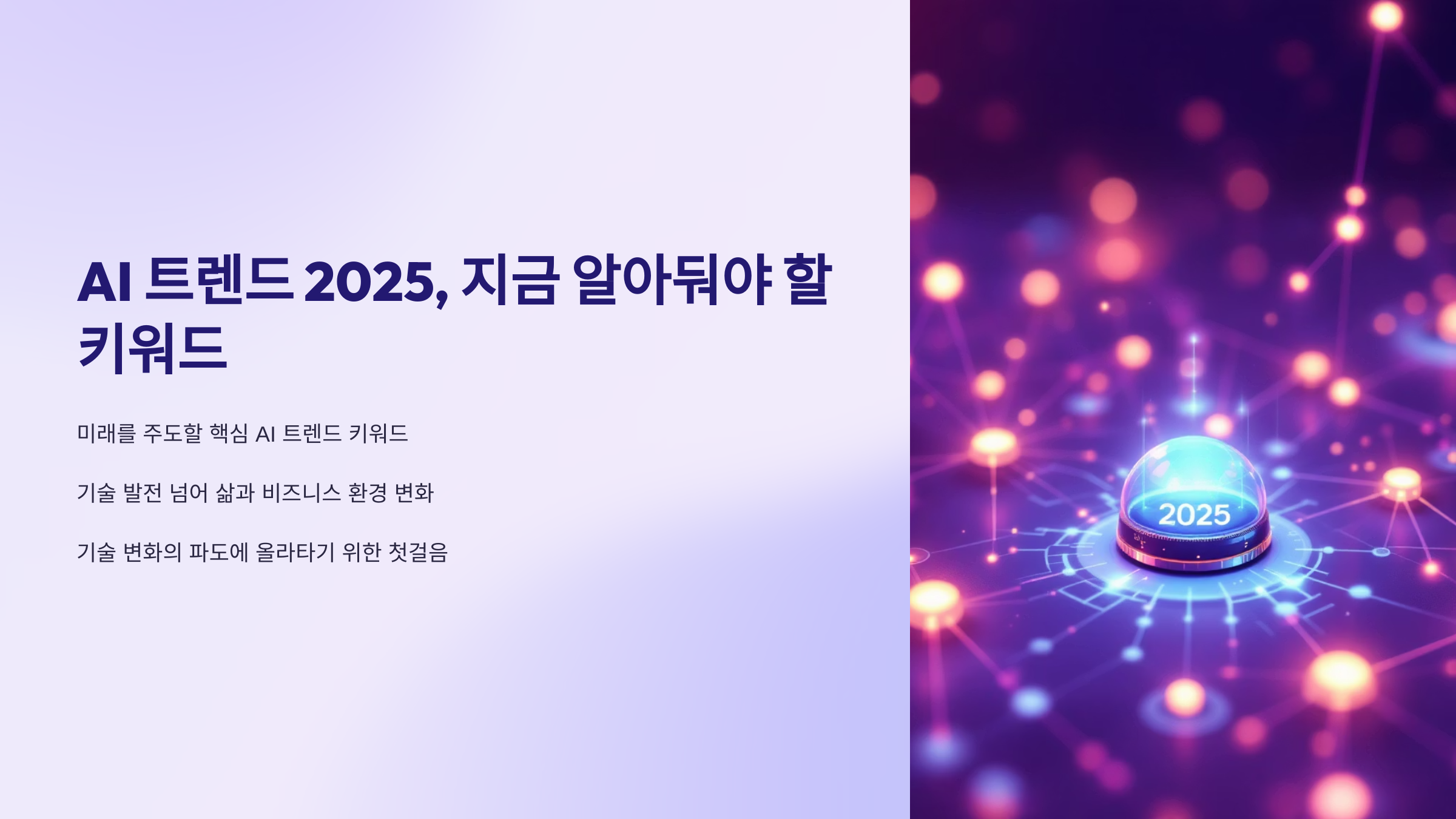 다가올 2025년, AI는 또 어떤 혁신을 가져올까요? 미래를 주도할 핵심 'AI 트렌드 2025' 키워드를 놓치지 마세요. 단순히 기술 발전을 넘어 우리 삶과 비즈니스 환경을 근본적으로 바꿀 변화의 씨앗, 그 중심에는 어떤 키워드들이 숨 쉬고 있을까요? 기술 변화의 파도에 올라타기 위한 첫걸음, 지금 시작합니다.